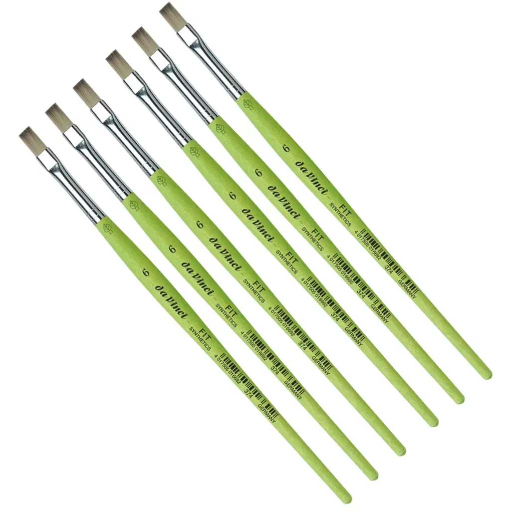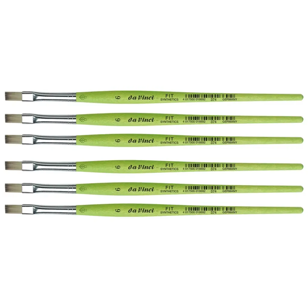 da Vinci FIT Synthetics Student Brush, Synthetic, Acrylic & Tempera, Flat, Series 374, Size 6, Pack of 6 | Thanks to a specifically developed, flexible, grey synthetic fiber we have created a hobby and school painting brush, which fascinates not only by its interesting look but also by its attractive price. This innovative product offers better performance than the traditional school brush with natural hair when it comes to stroke control and color absorbing capacity. The brush features a green, matte handle with seamless, rust-proof aluminum ferrules. Made in Germany. 100% Vegan. Sold as a pack of 6.