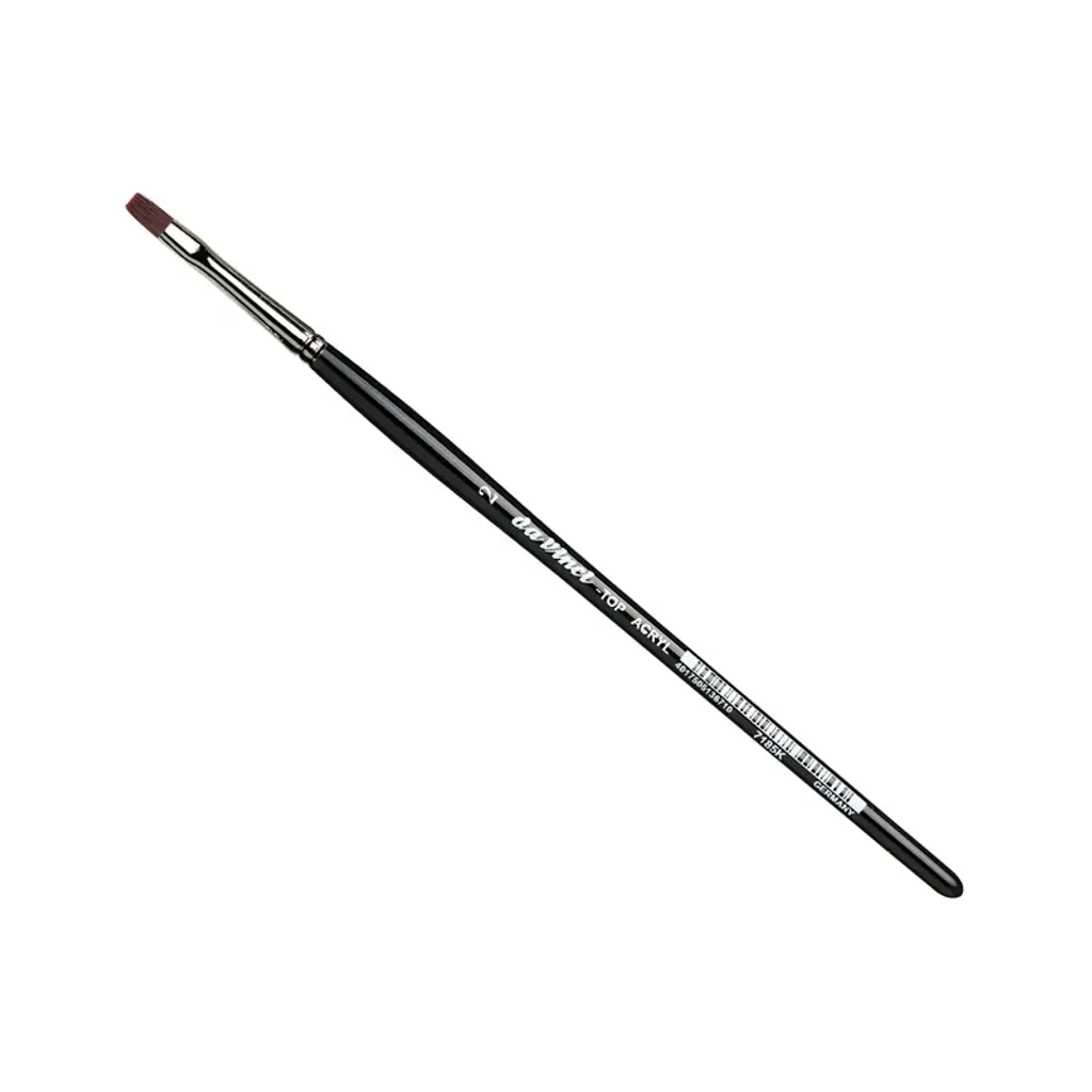 da Vinci TOP-ACRYL Bright Red-Brown Brush, Synthetic, Acrylic & Oil, Flat, Series 7185K, Size 2 | Extra strong and stiff for acrylics, oils & water-mixable oils TOP-ACRYL is constructed with 5 different diameters of extra strong Synthetic Bristle. Short "no-roll" handles fit right in your smaller painting box or travel easel. Exclusive design developed by da Vinci. Extra stiff with a precise snap, and a favorite of Impasto painters (who use thick applications of paint). Whether massing color in the larger sizes or precision painting in the smaller sizes, TOP-ACRYL brushes offer the artist versatility and ruggedness. This brush features short, black, polished, hexagonal handles that prevent the brush from rolling away and the hand from getting tired during painting.