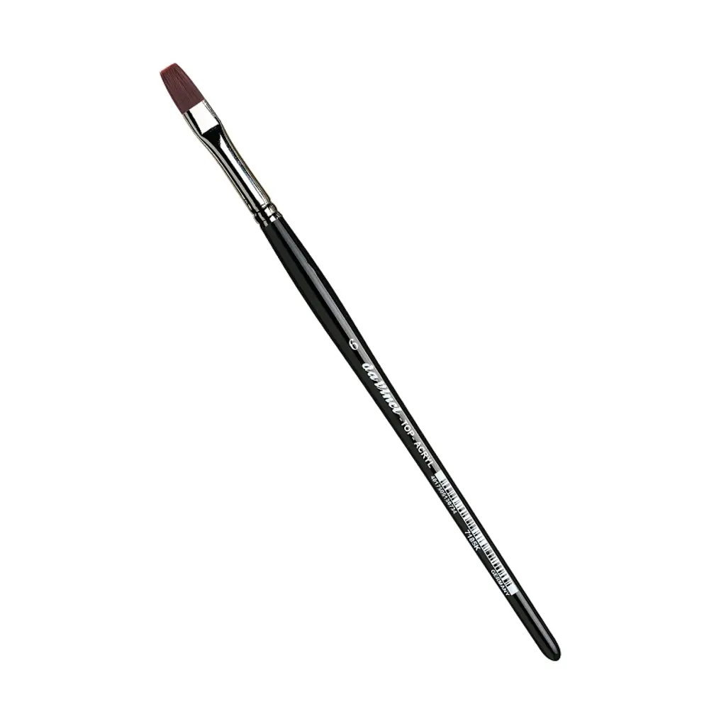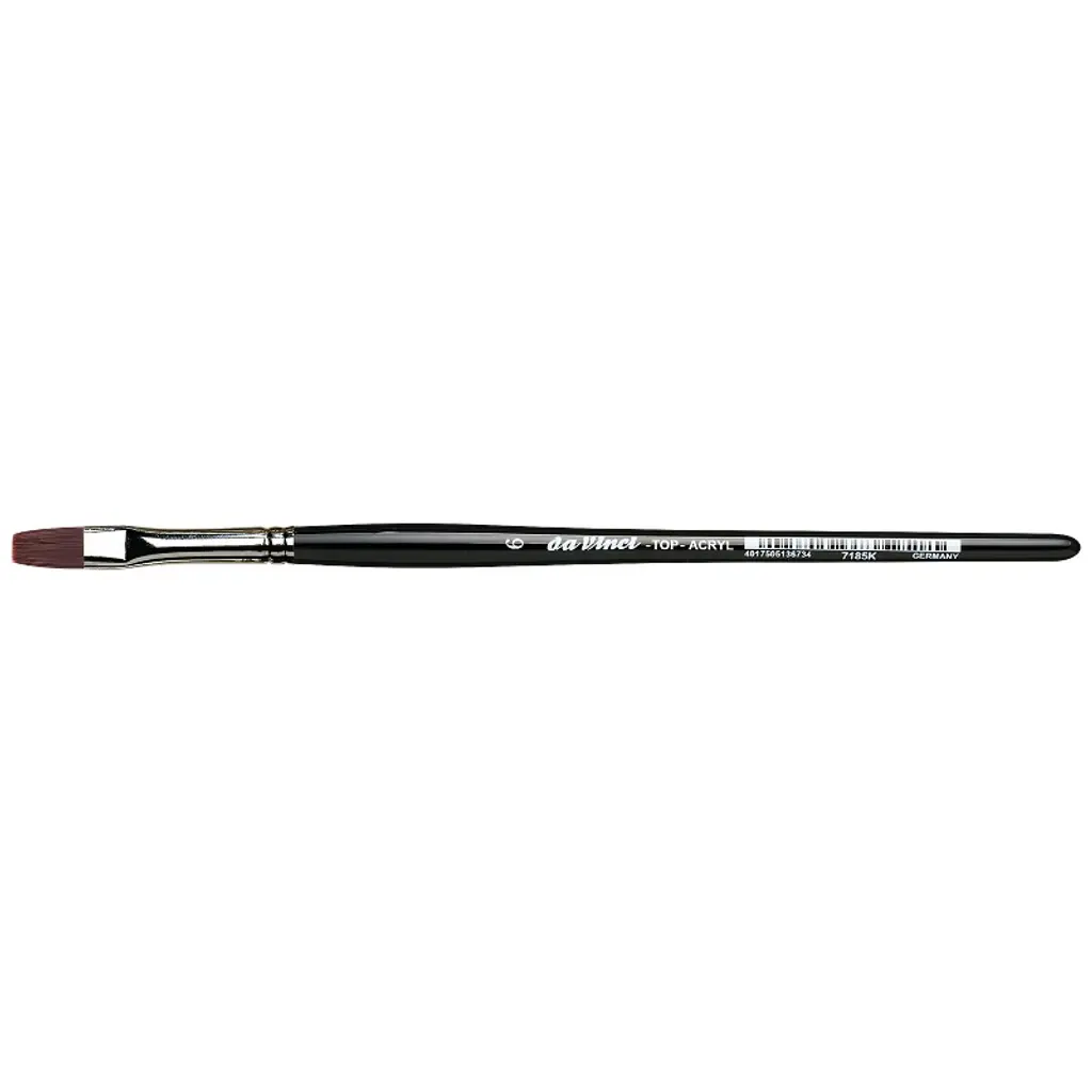 da Vinci TOP-ACRYL Bright Red-Brown Brush, Synthetic, Acrylic & Oil, Flat, Series 7185K, Size 6 | Extra strong and stiff for acrylics, oils & water-mixable oils TOP-ACRYL is constructed with 5 different diameters of extra strong Synthetic Bristle. Short "no-roll" handles fit right in your smaller painting box or travel easel. Exclusive design developed by da Vinci. Extra stiff with a precise snap, and a favorite of Impasto painters (who use thick applications of paint). Whether massing color in the larger sizes or precision painting in the smaller sizes, TOP-ACRYL brushes offer the artist versatility and ruggedness. This brush features short, black, polished, hexagonal handles that prevent the brush from rolling away and the hand from getting tired during painting.