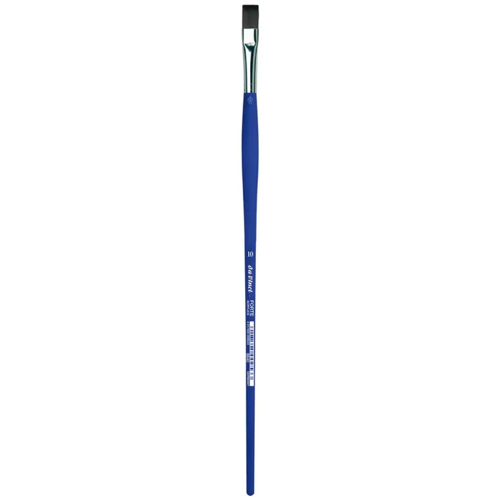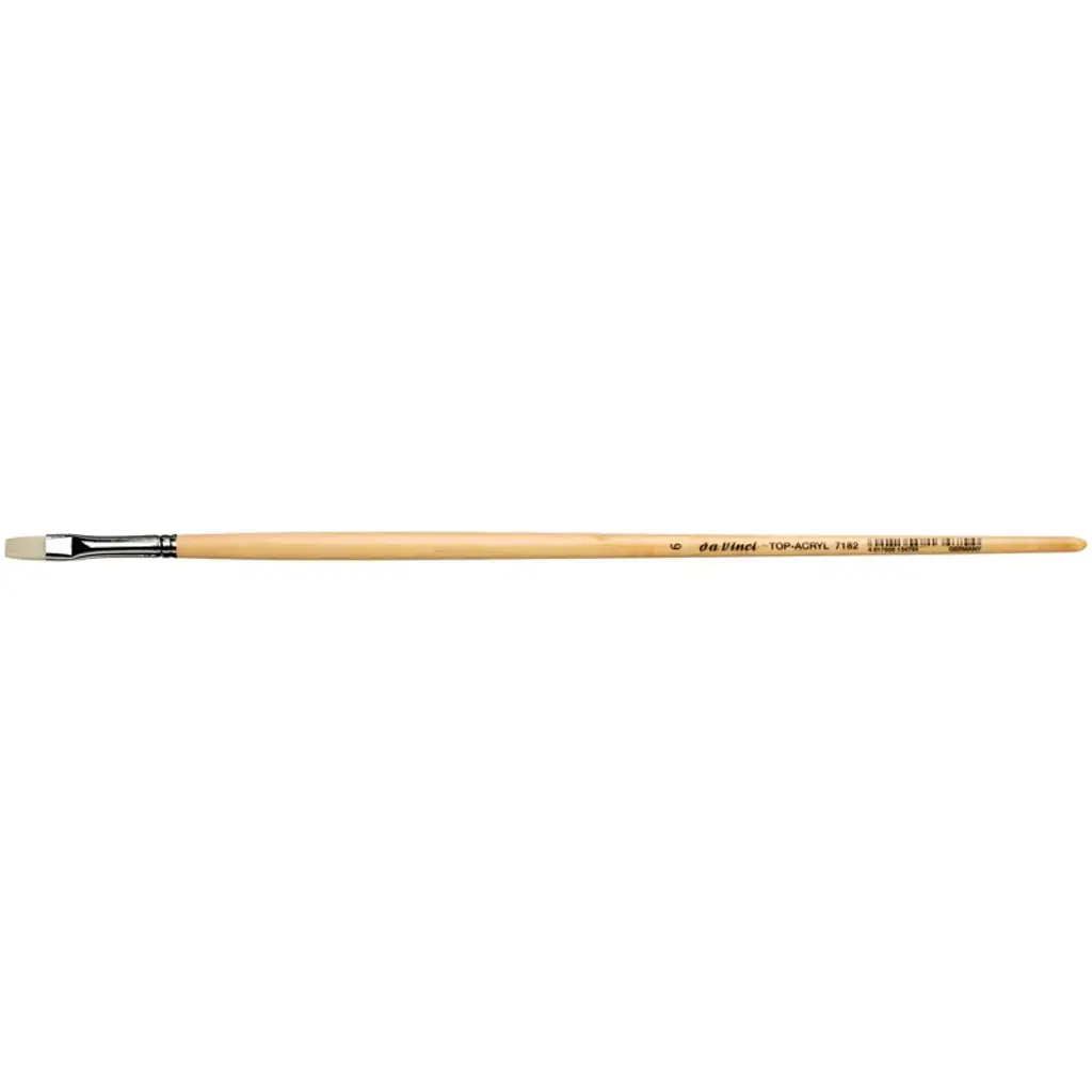 da Vinci TOP-ACRYL Bright White Brush, Synthetic, Acrylic & Oil, Flat, Series 7182, Size 6 | Extra strong and stiff for acrylics, oils & water-mixable oils TOP-ACRYL is constructed with 5 different diameters of extra strong Synthetic Bristle. Long handles fit right in your painting box or travel easel. Exclusive design developed by da Vinci. Extra stiff with a precise snap, and a favorite of Impasto painters (who use thick applications of paint). Whether massing color in the larger sizes or precision painting in the smaller sizes, TOP-ACRYL brushes offer the artist versatility and ruggedness. The brush features a long, natural, polished handle.