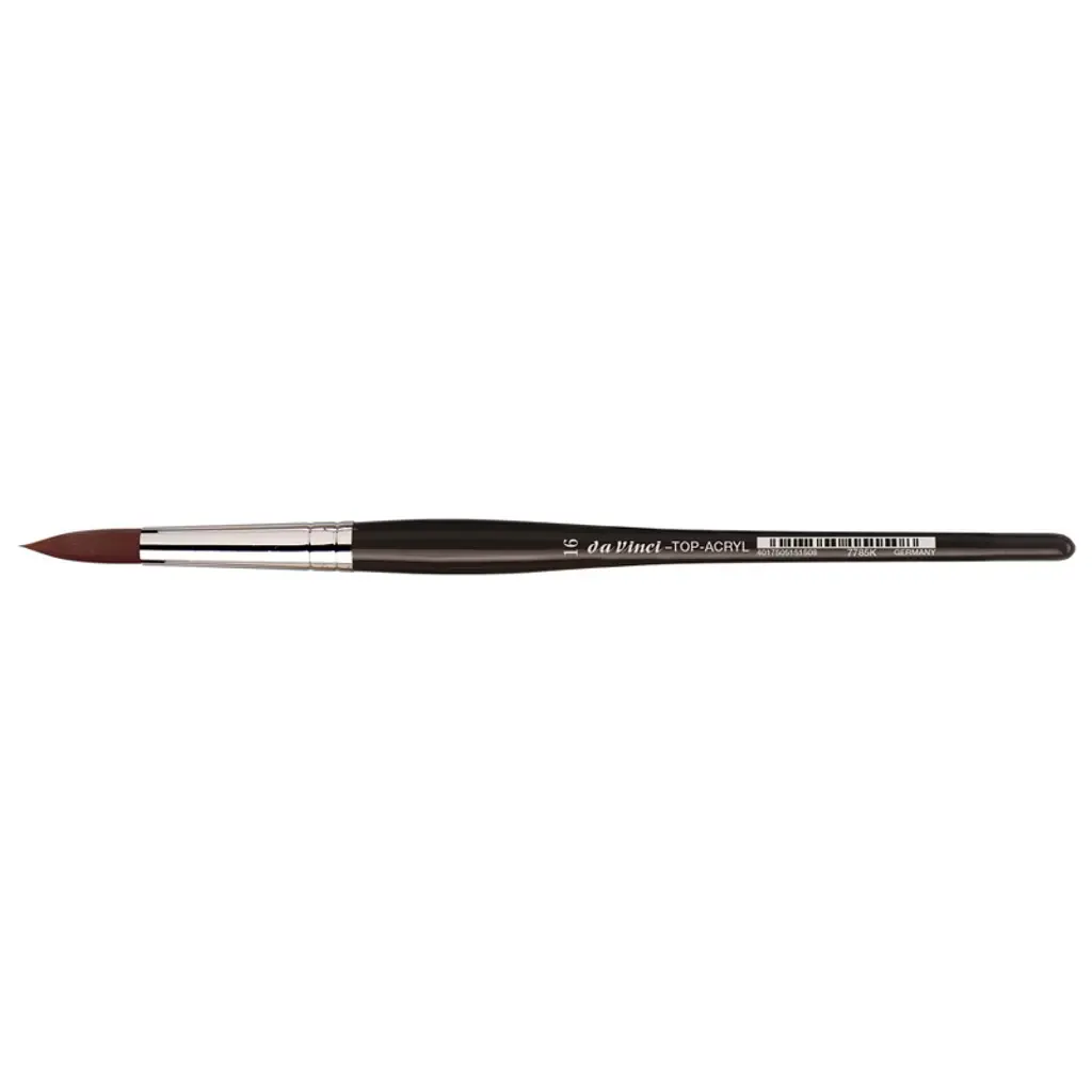 da Vinci TOP-ACRYL Red-Brown Brush, Synthetic, Acrylic & Oil, Round, Series 7785K, Size 16 | Extra strong and stiff for acrylics, oils & water-mixable oils TOP-ACRYL is constructed with 5 different diameters of extra strong Synthetic Bristle. Short "no-roll" handles fit right in your smaller painting box or travel easel. Exclusive design developed by da Vinci. Extra stiff with a precise snap, and a favorite of Impasto painters (who use thick applications of paint). Whether massing color in the larger sizes or precision painting in the smaller sizes, TOP-ACRYL brushes offer the artist versatility and ruggedness. This brush features short, black, polished, hexagonal handles that prevent the brush from rolling away and the hand from getting tired during painting.