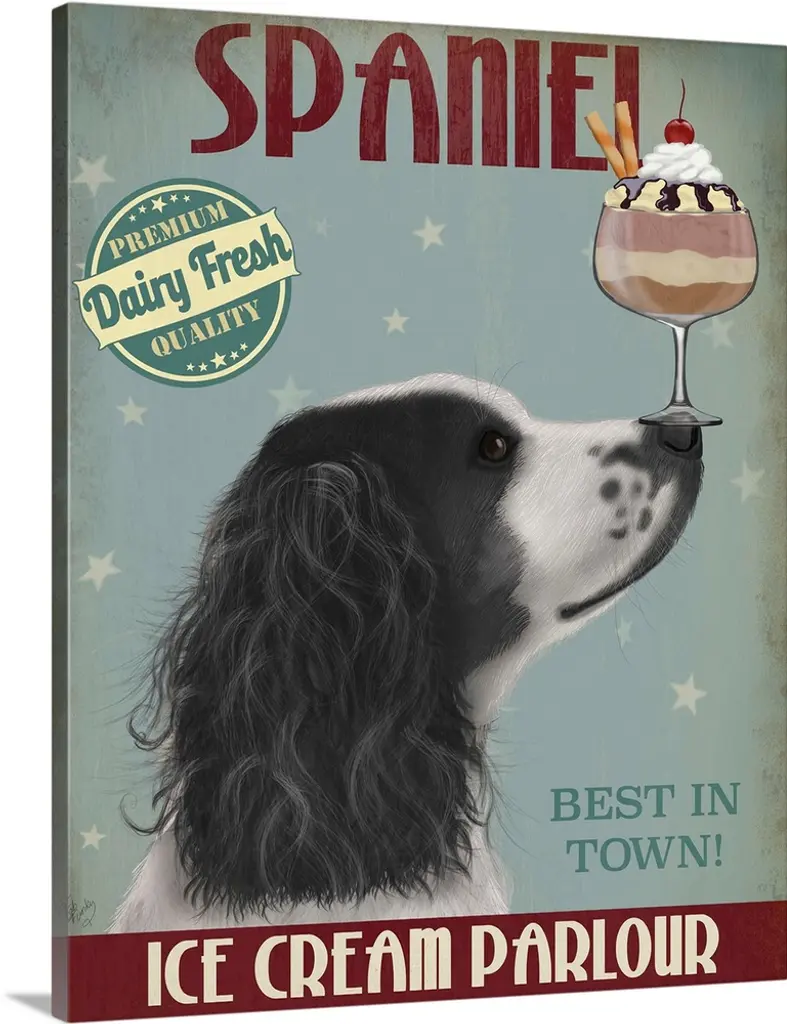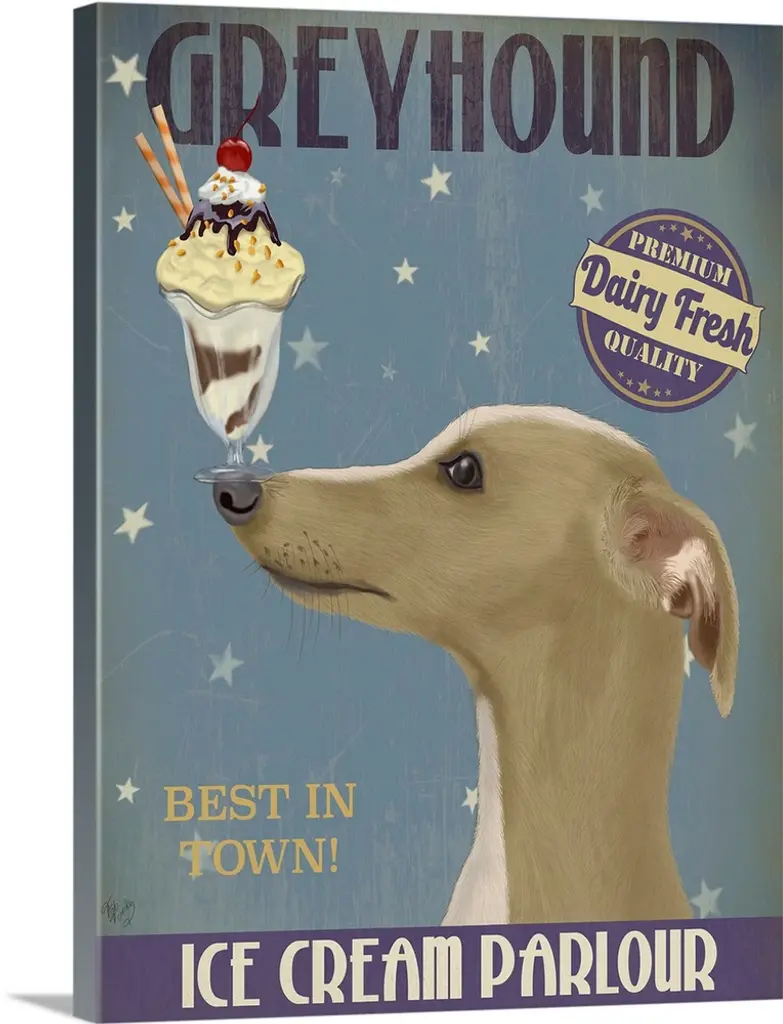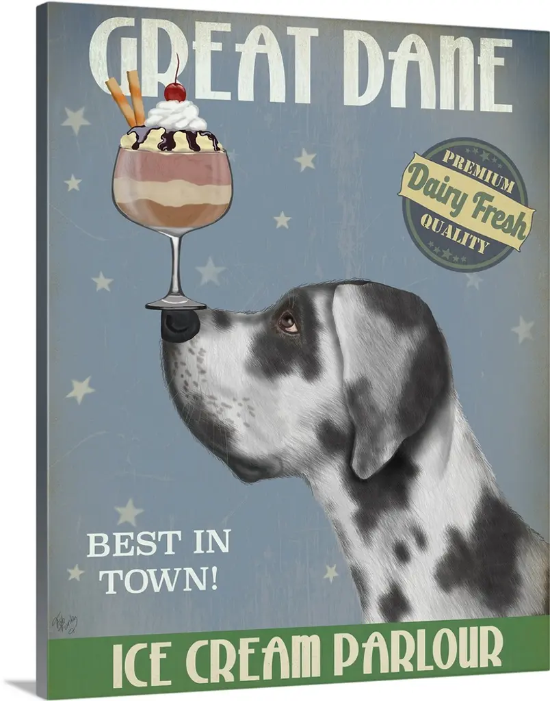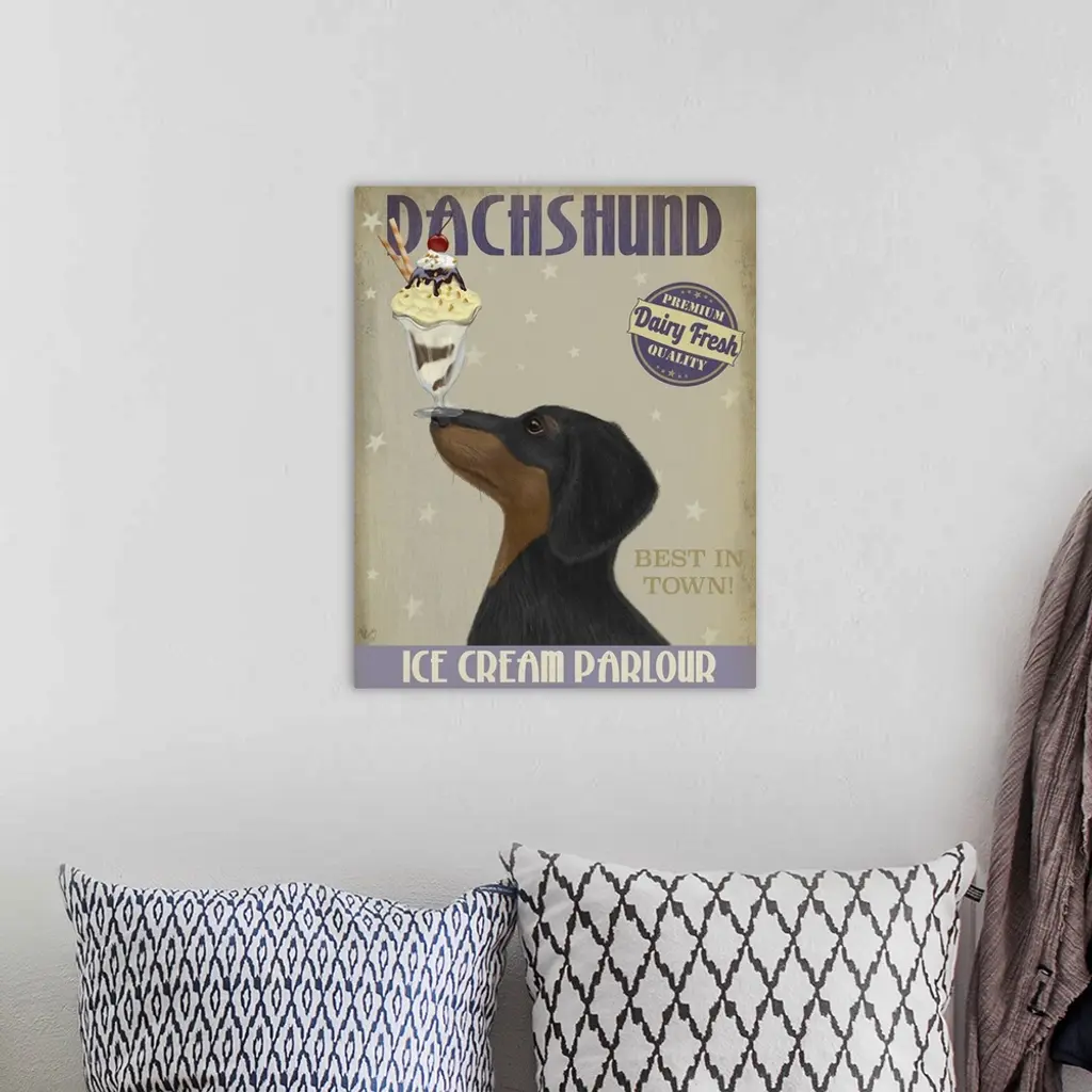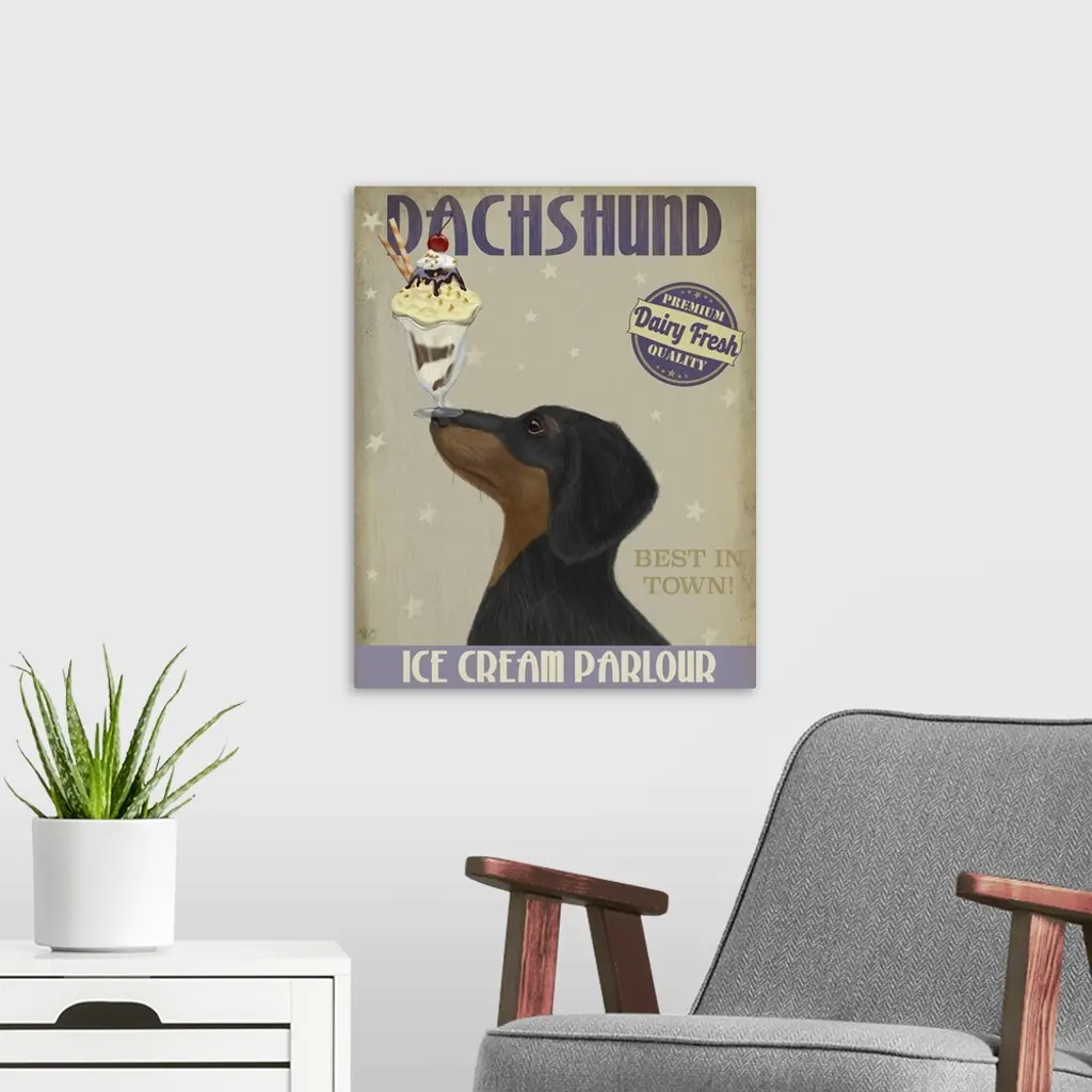 Decorative artwork of a Dachshund balancing an ice cream sundae on its nose in an advertisement for an ice cream parlour.