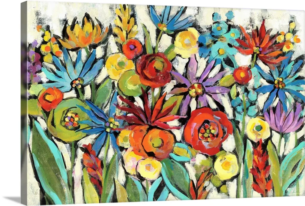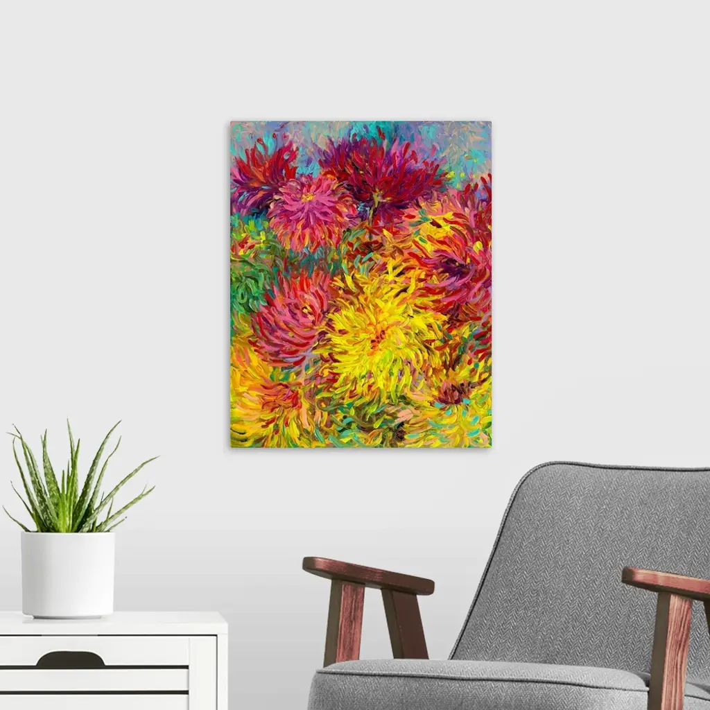 Brightly colored contemporary artwork of red and yellow dahlias.