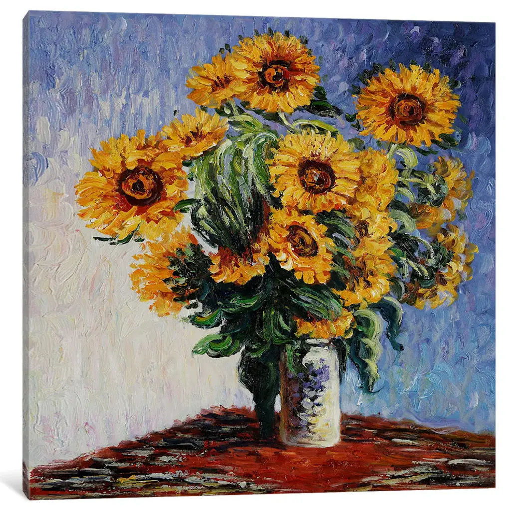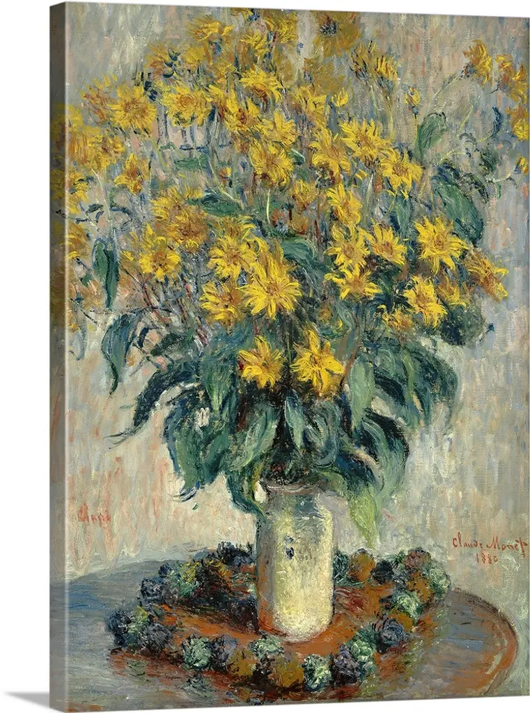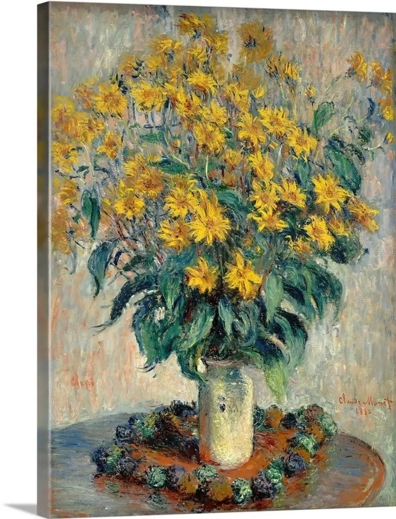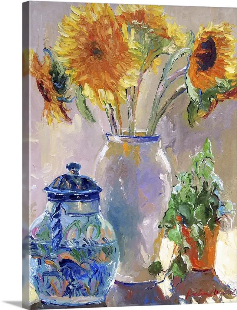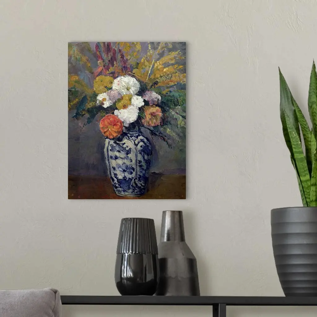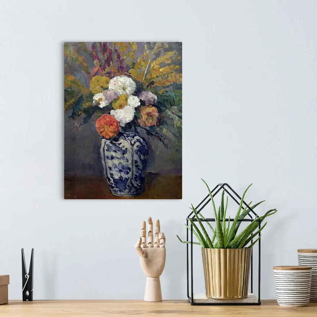 A painting by a classic art master, this is a vertical still life of fresh cut flowers in a blue china vase.