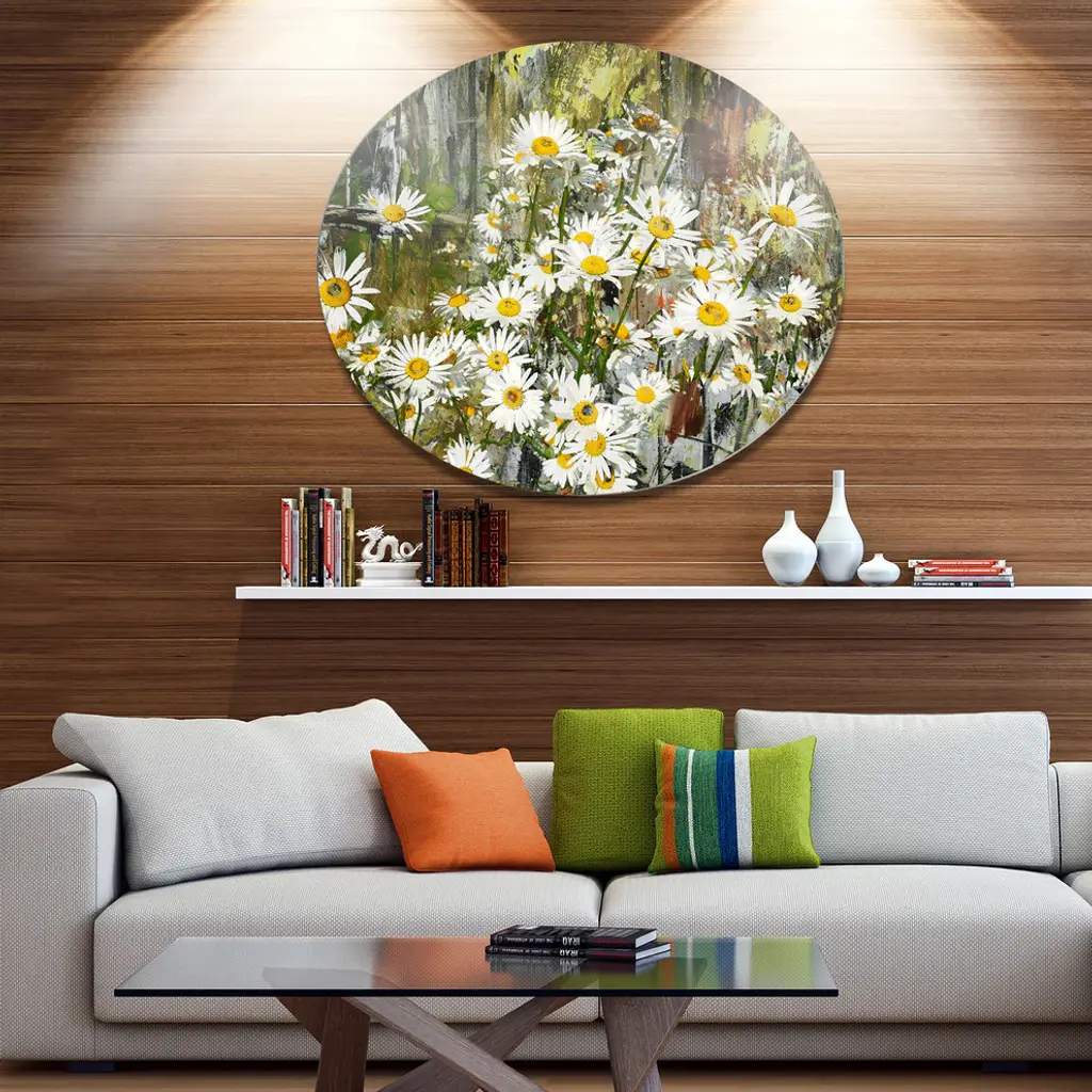 Bring Contemporary Abstraction to your home with this large Circle Metal wall art. This Daisies Flowers Under the Window Metal Artwork makes it the focal point of any room or office. - White Gloss Coating ensures colors are extra vibrant with light reflection.- Aluminum grade Sheet Metal with 1 inch mounting frame on the back giving the illusion that the artwork is floating on the wall..- Mounting Brackets are included along with instructions.- High Quality Digital images are created directly into a glossy aluminum panel producing a stunning and captivating print into the glossy finish of the metal.- Water, Fire and Scratch resistant HD Aluminum panels.- Looks better than any photo paper and guaranteed to last at least 20 years- Easy to clean with a microfiber cloth. Colors are far superior to regular Canvas Art. - Easy to Hang