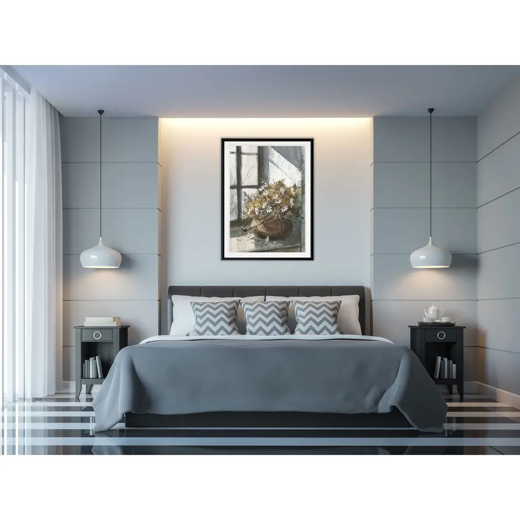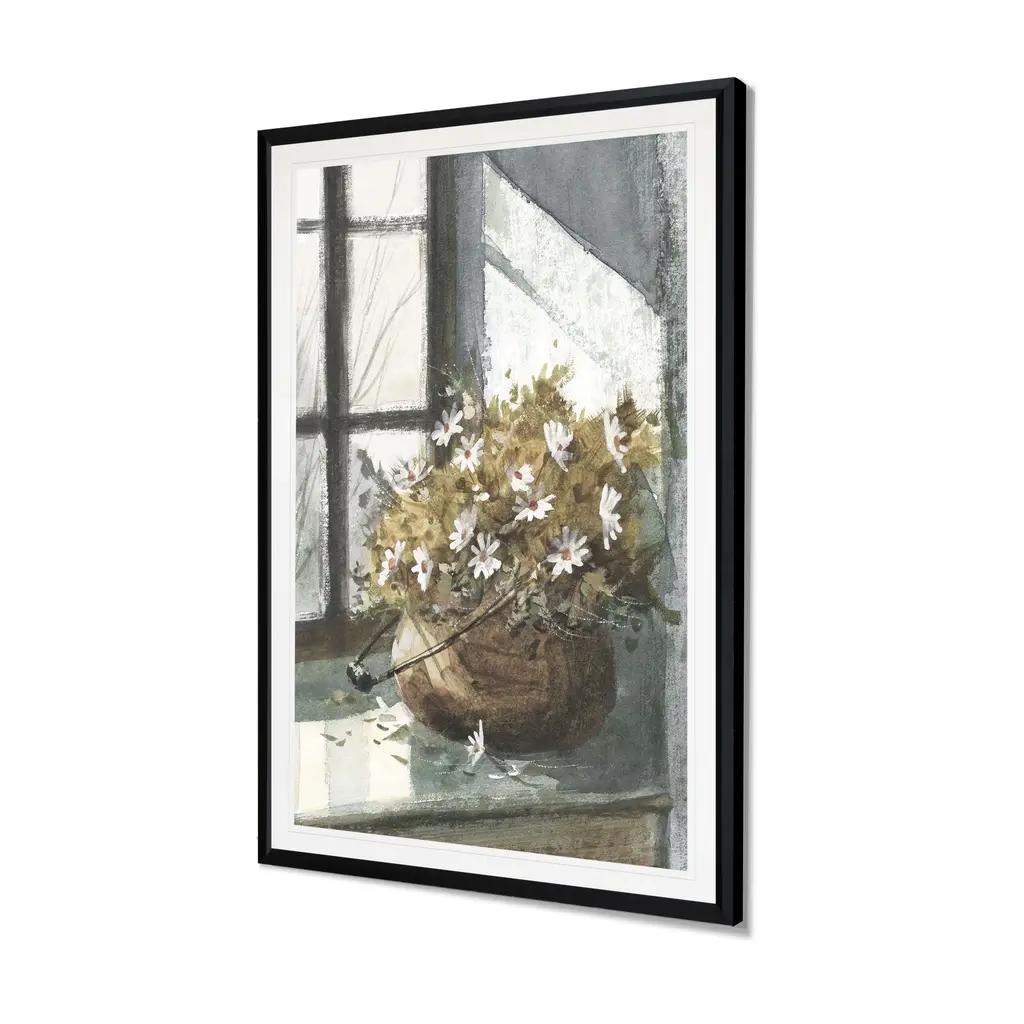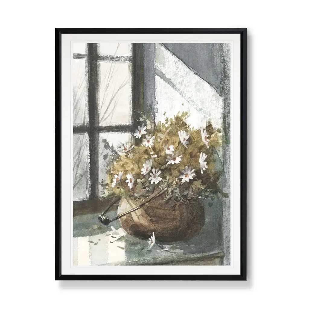 Daisies In The Window-Framed Giclee Print A premium framed giclee print Printed using the last archival inks. Each print is carefully printed and framed by hand. Each piece features a 2'' Beveled matt board, acrylic glass and comes ready to hand. 4 SIZES AVILABLE 18''X24''- Overall Size 22''x30''- Overall Size 26''x26''' - Overall Size 30''x42''' - Overall Size ** Overall size may vary slightly from piece to piece Each piece is made to order. Built to Last Each piece comes ready to hang Archival Ink 2'' Matt Board Assembled by hand in the America