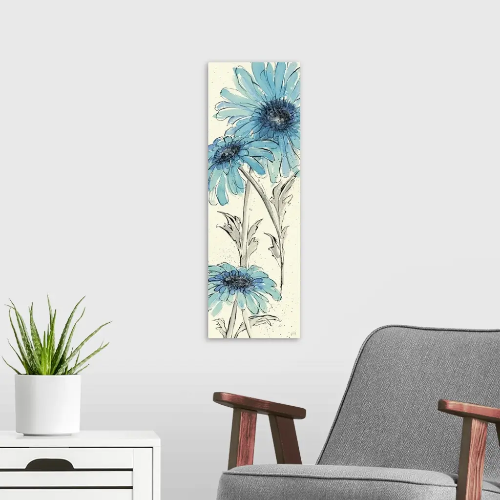 Contemporary artwork of blue flowers close-up in the frame of the image.