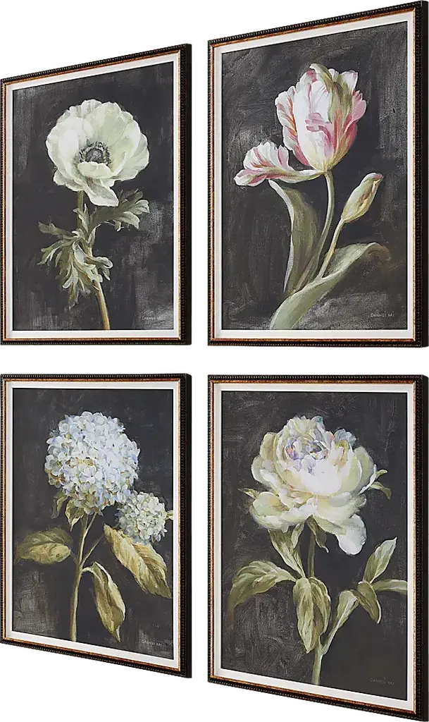 Accentuate your space with this assortment of traditional botanical Daiva prints. Each individual piece features a white flower with a hint of either dusty blue, lilac and rose pink, elegantly complemented by a rich, moody green leaf and stem. Petite, dark brown frames with a heavy mocha wash paired with gold plated inner lips. Each print is placed under a protective glass.