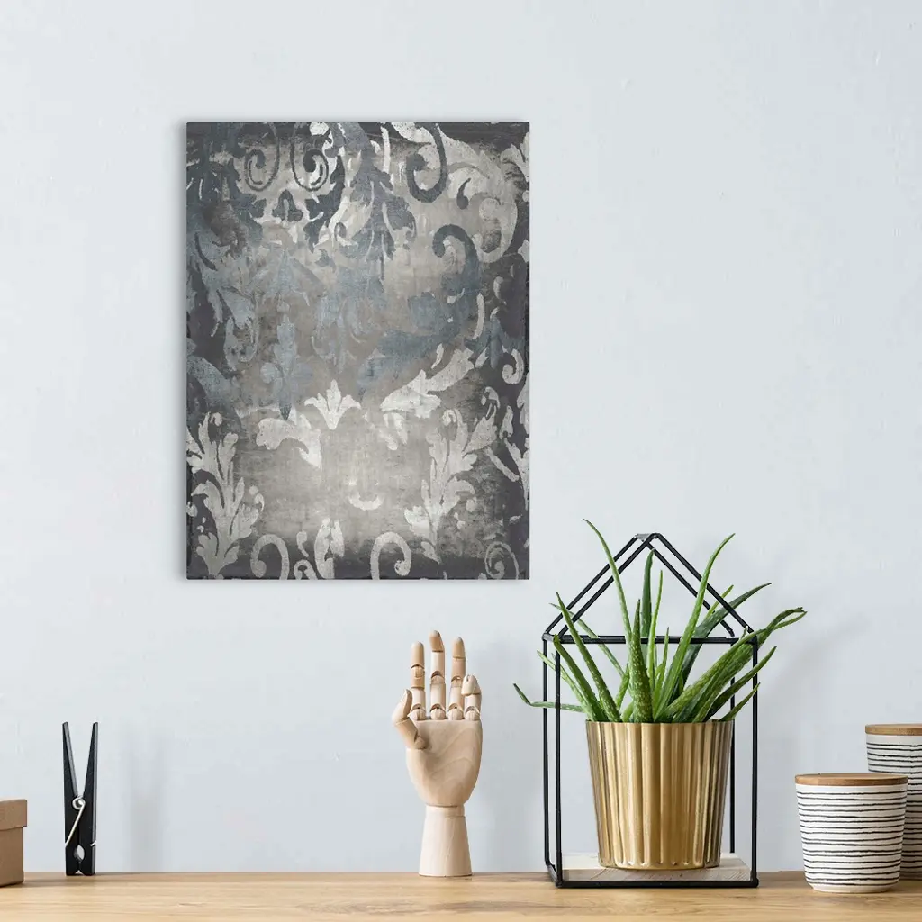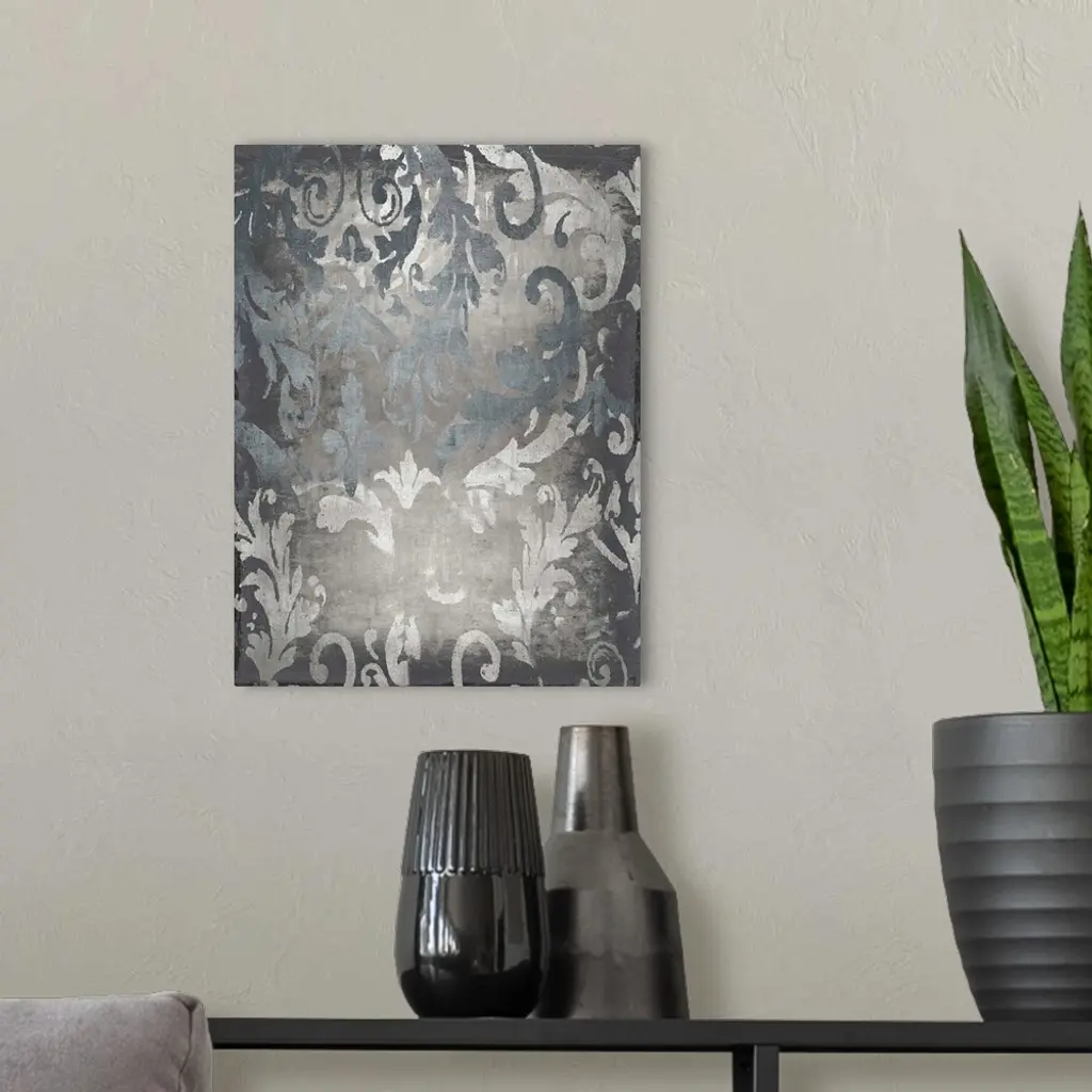 Contemporary artwork featuring silver damask designs over a distressed background with a foil texture throughout.