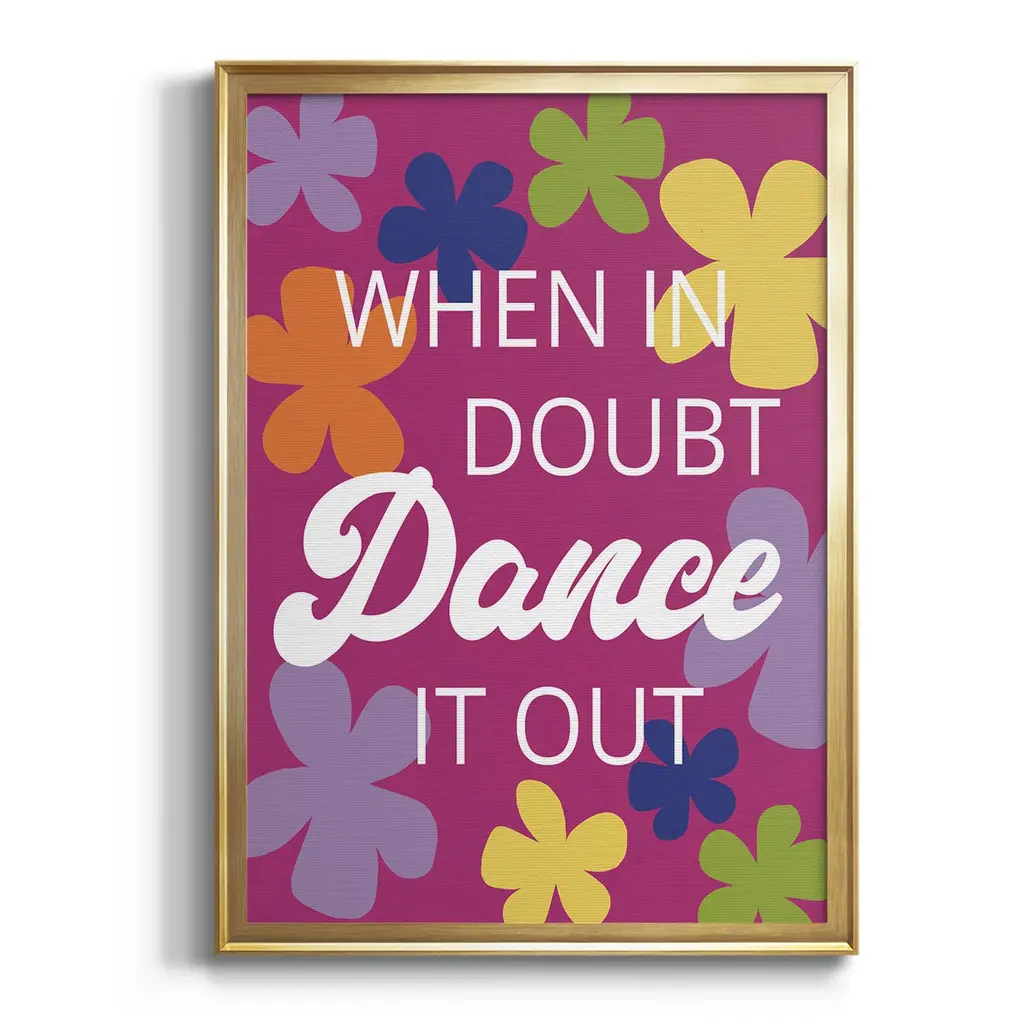Dance It Out Premium Framed Print - Ready to Hang A Premium Framed Print created to last. Framed in distressed wood and available in an array of sizes and colors Featuring a beveled a solid wood stretcher bar, each piece comes ready to hand 4 SIZES AVAILABLE 30.5''X42.5'' - Overall Size 26.5'X36.5'' - Overall Size 22.5''x30.5'' - Overall Size 18.5''x24.5'' - Overall Size Each piece is made to order. Each piece comes with hanging hardware. Made in the USA Ready to Hang