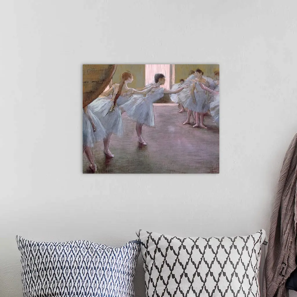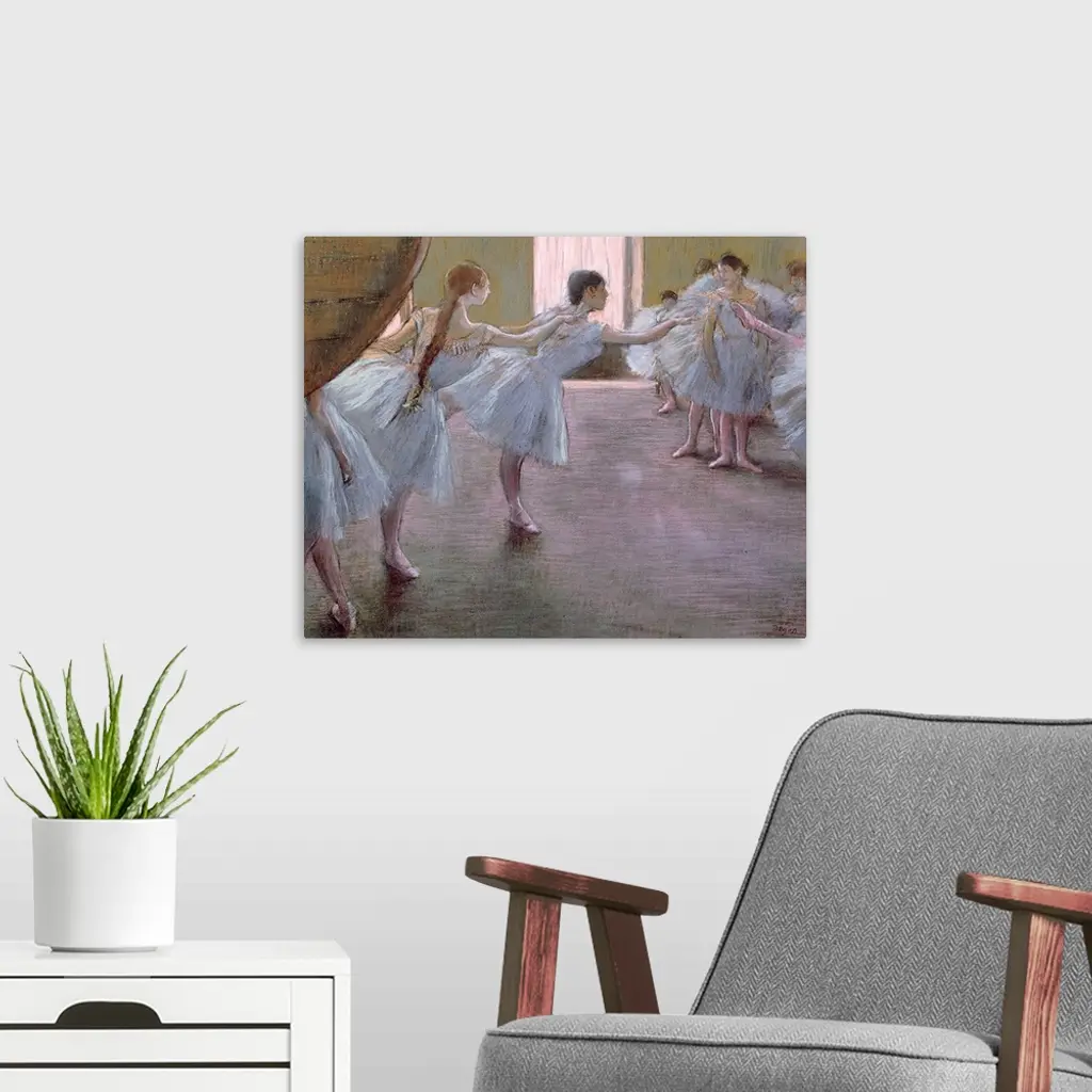 Landscape classic painting on a big canvas of a large group of ballet dancers as they practice together in a studio.