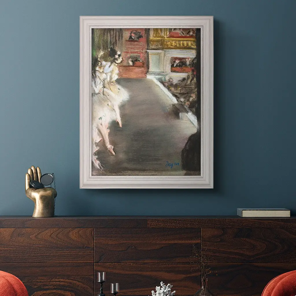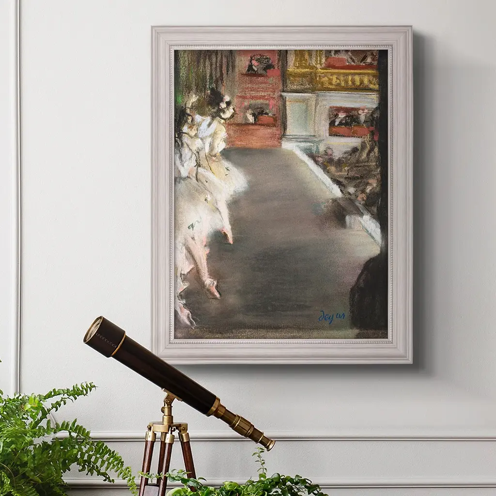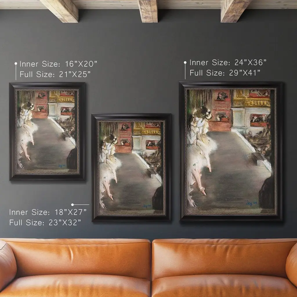 Dancers at the Old Opera House Premium Framed Canvas- Ready to Hang A Premium Framed Canvas created to last. Framed in distressed wood and available in an array of sizes and colors Featuring a beveled a solid wood stretcher bar, each piece comes ready to hand 3 SIZES AVAILABLE 16''X20'' - Overall Size 18'X27'' - Overall Size 24''x36'' - Overall Size Each piece is made to order. Each piece comes with hanging hardware. Made in the USA Ready to Hang Giclee Paper Print Acrylic Glass Beveled Matt Board