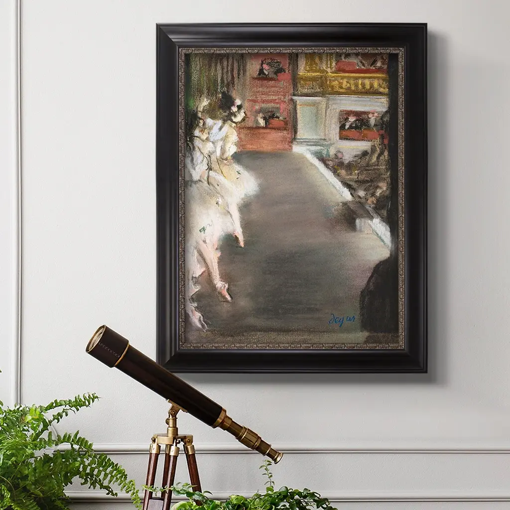Dancers at the Old Opera House Premium Framed Canvas- Ready to Hang A Premium Framed Canvas created to last. Framed in distressed wood and available in an array of sizes and colors Featuring a beveled a solid wood stretcher bar, each piece comes ready to hand 3 SIZES AVAILABLE 16''X20'' - Overall Size 18'X27'' - Overall Size 24''x36'' - Overall Size Each piece is made to order. Each piece comes with hanging hardware. Made in the USA Ready to Hang Giclee Paper Print Acrylic Glass Beveled Matt Board