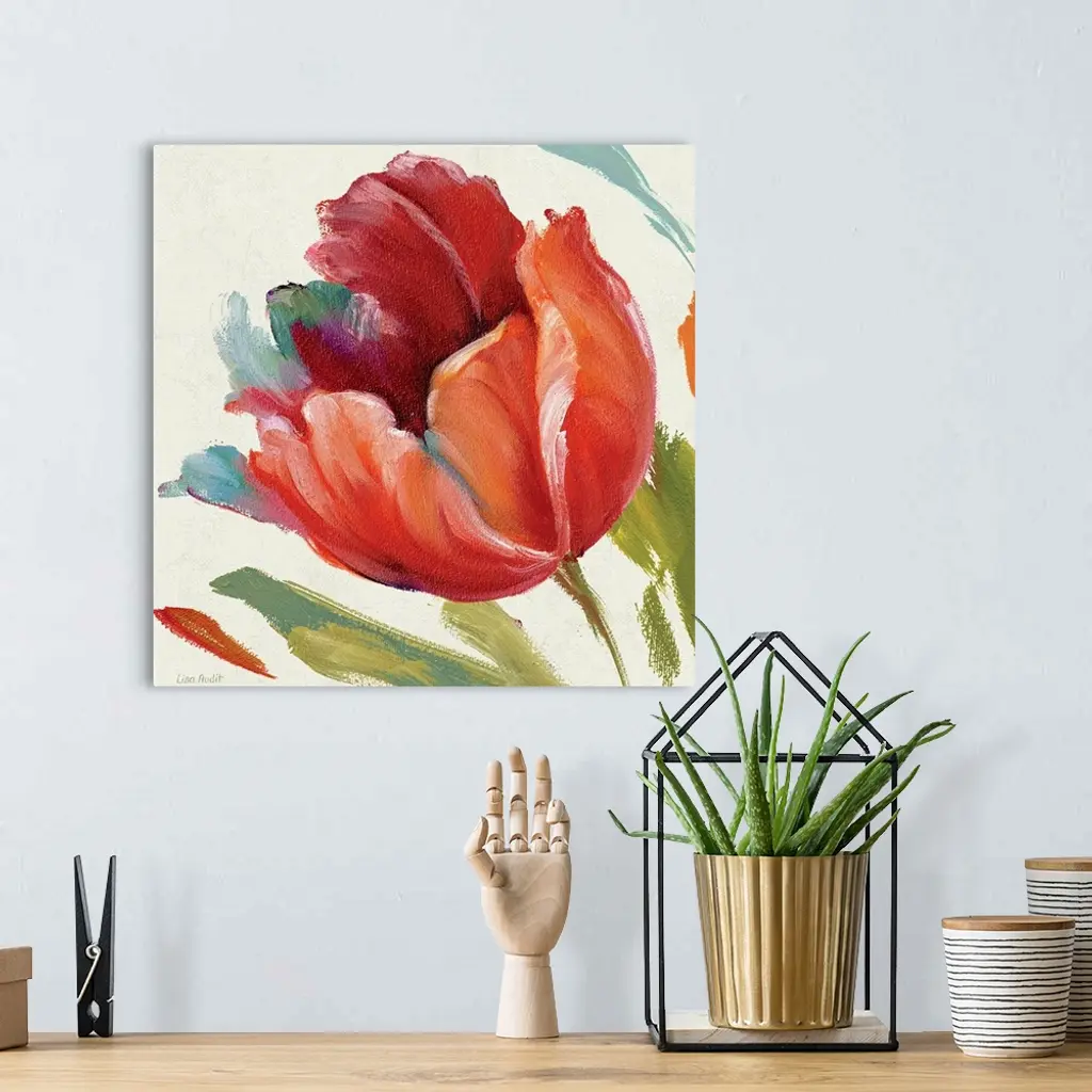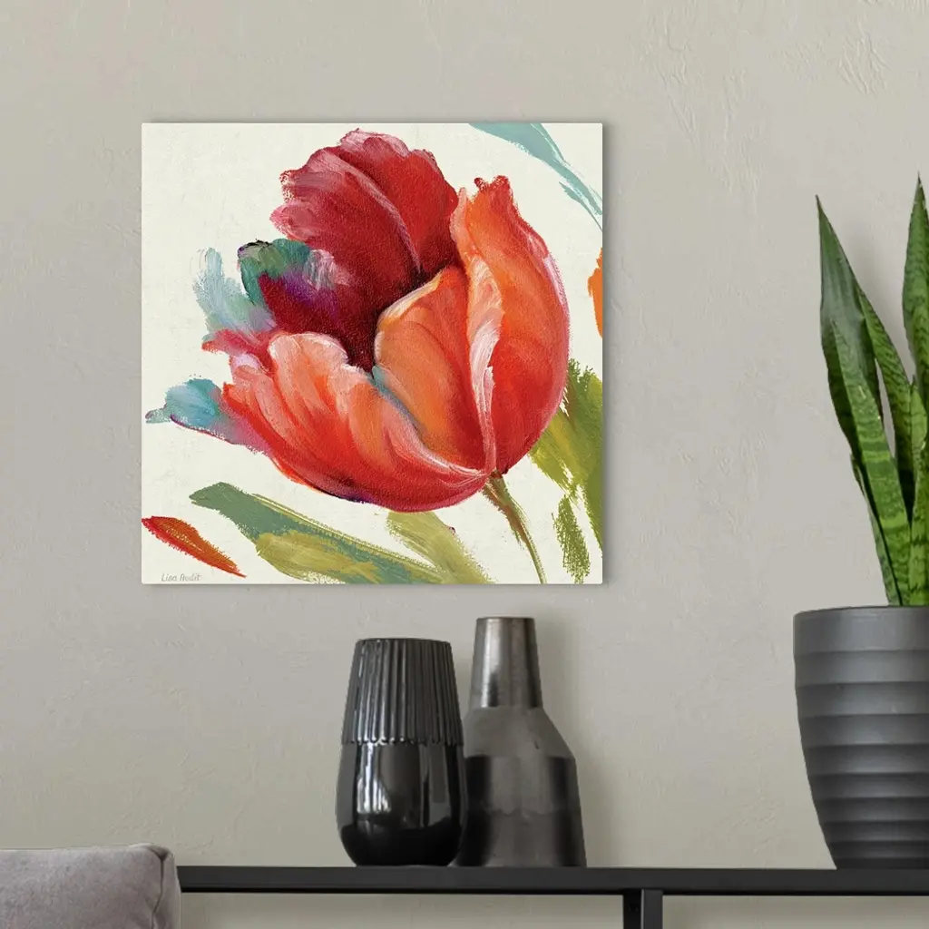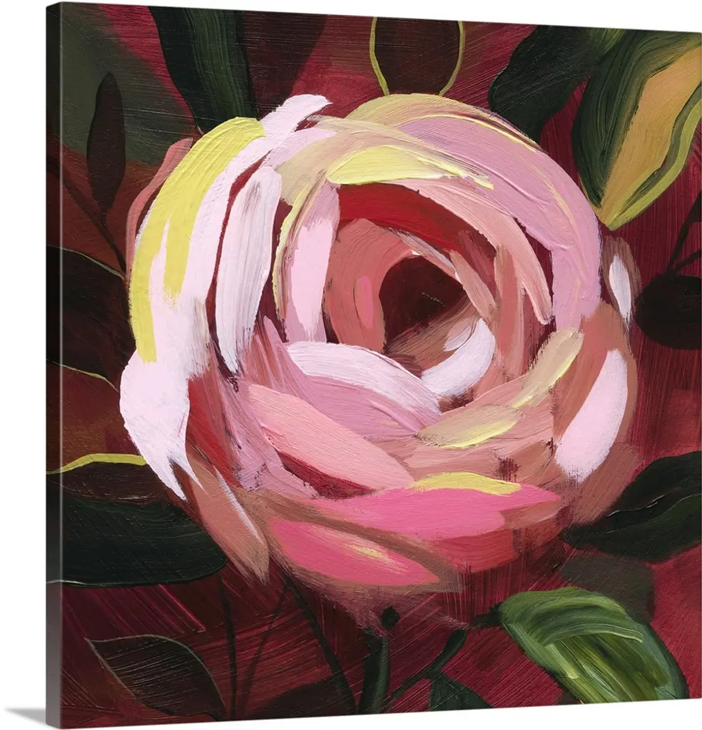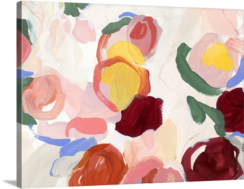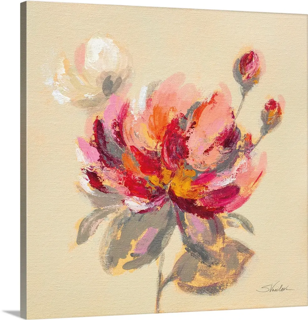 Contemporary painting of flower blossom with background full of thick colorful random brush strokes.