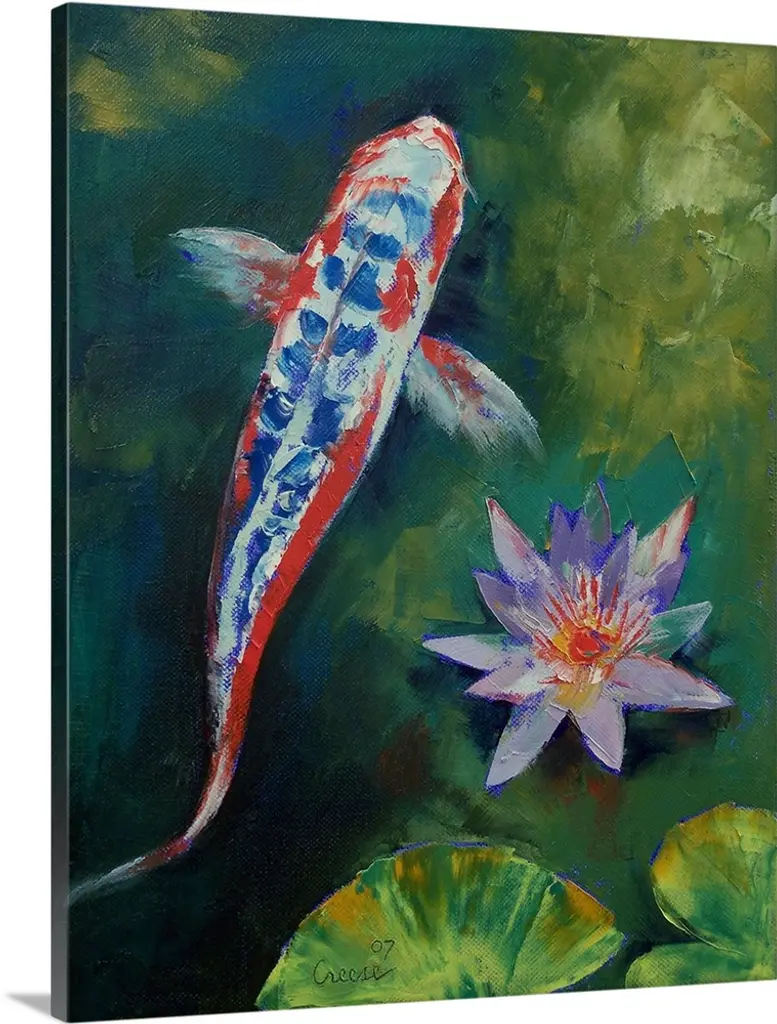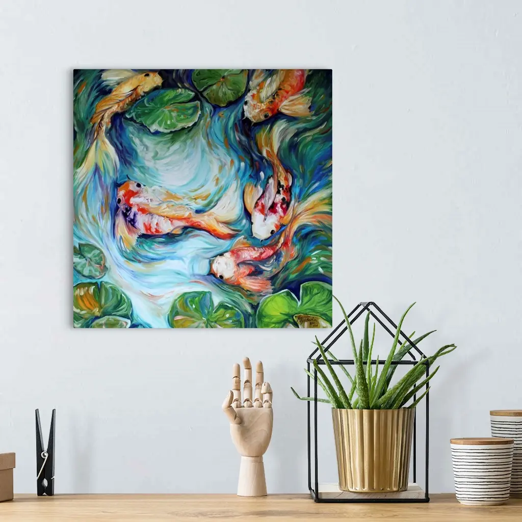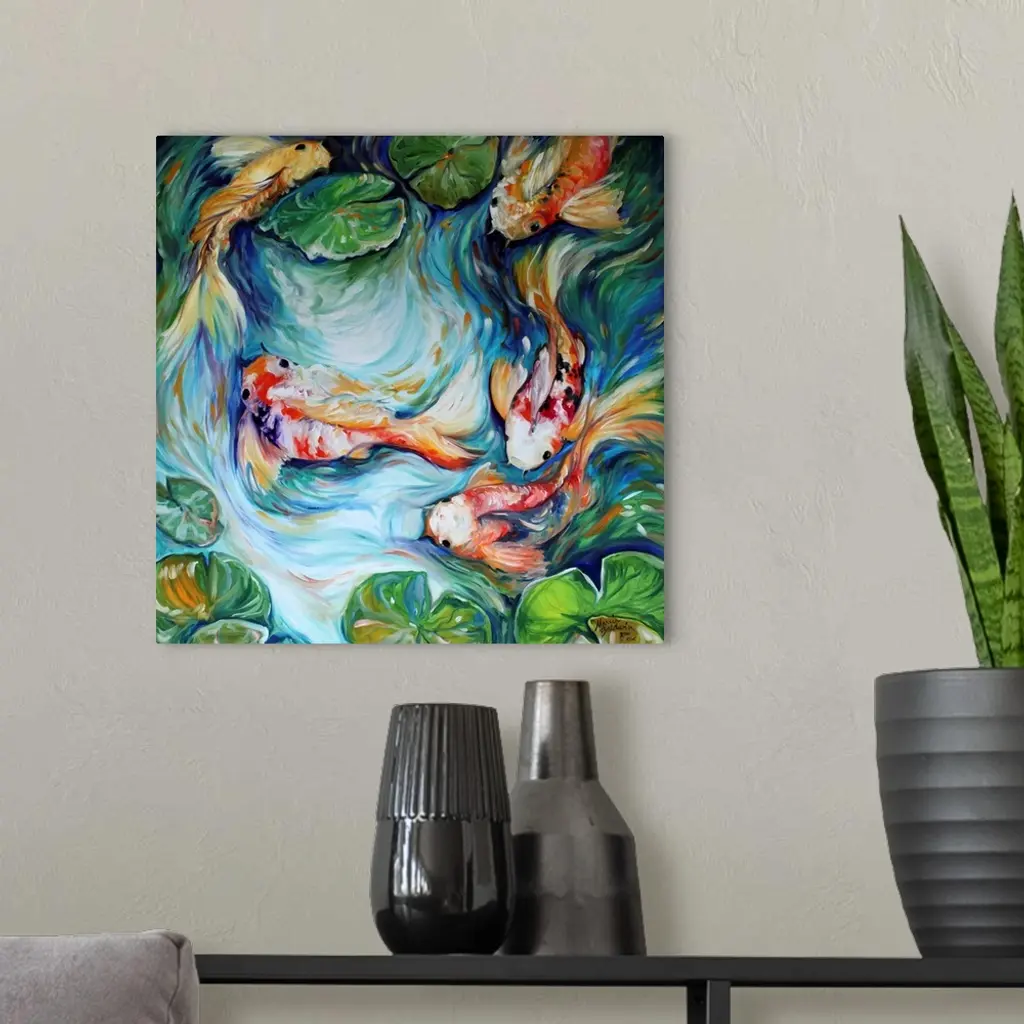 Square painting of five swimming koi fish in a pond with lily pads and curved brushstrokes.