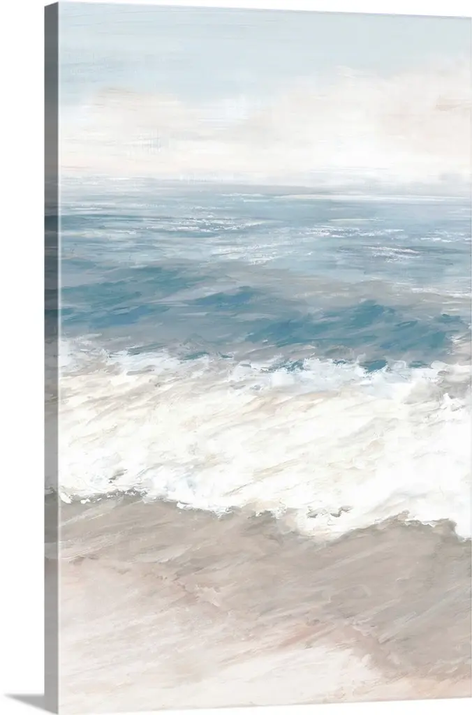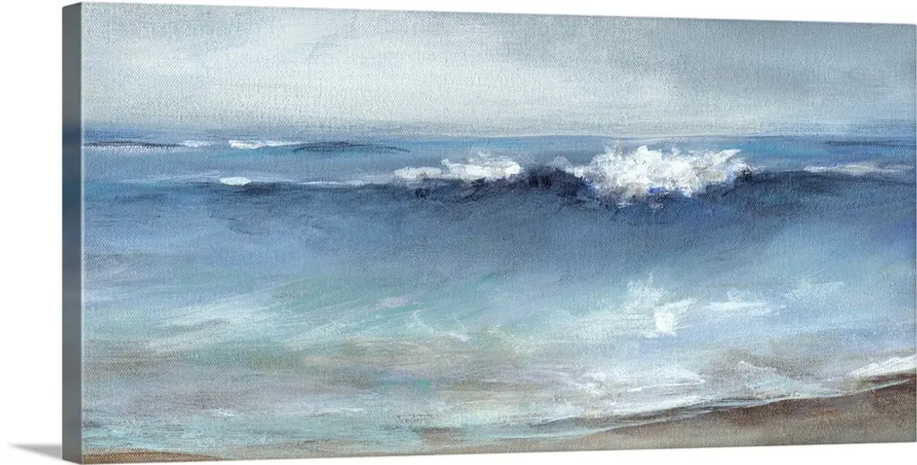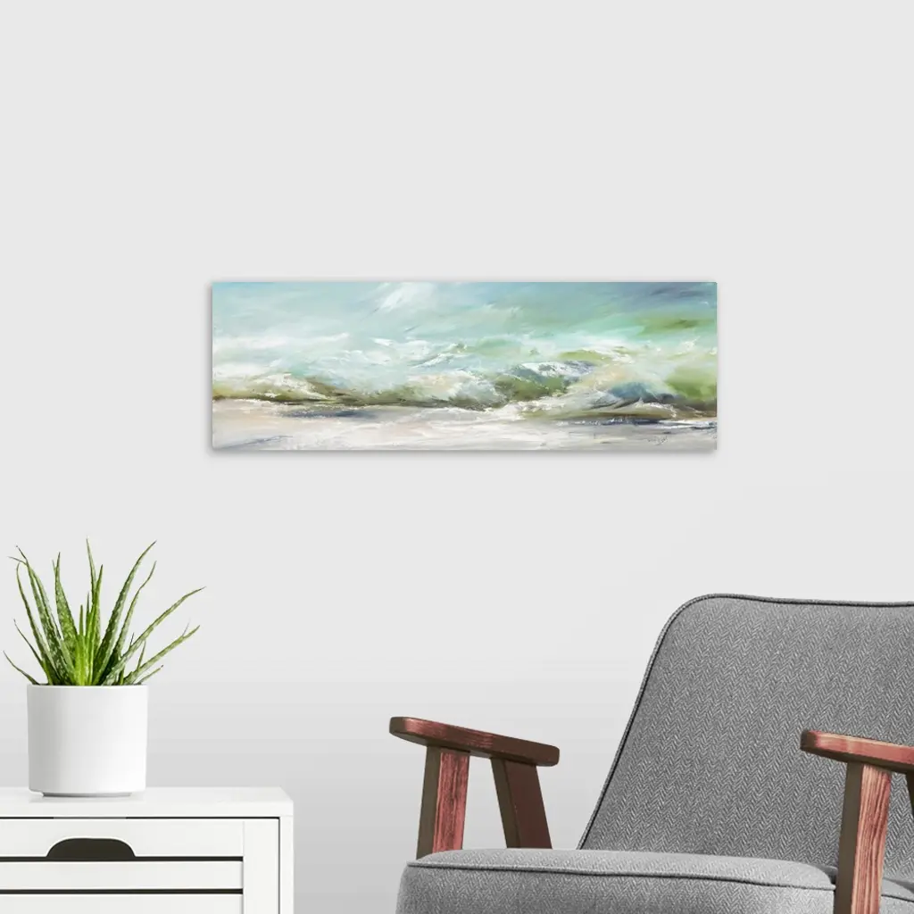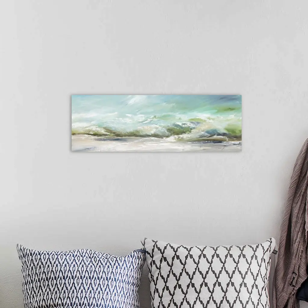 A contemporary panoramic painting of green ocean waves washing onto the sand - a calm image perfect for a beach cottage