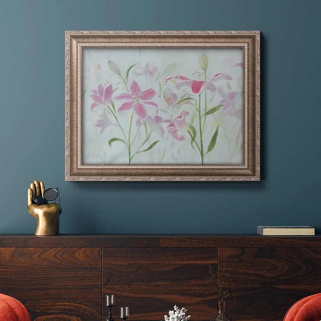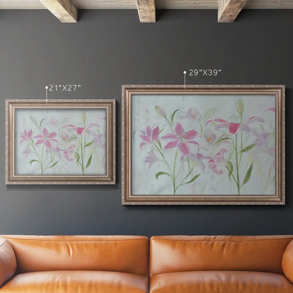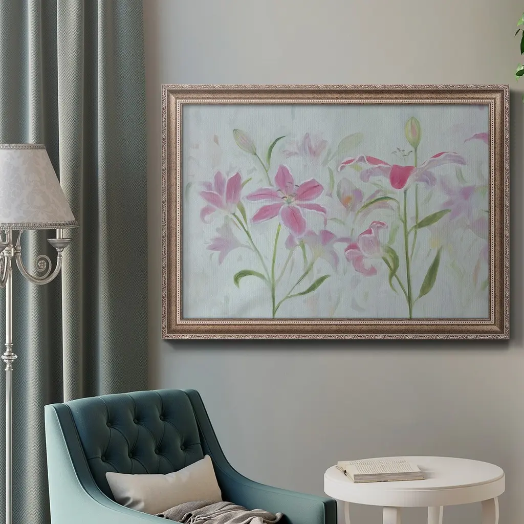 Dancing Pink Trio I Premium Framed Canvas- Ready to Hang A Premium Framed Canvas created to last. Framed in distressed wood and available in an array of sizes and colors Featuring a beveled a solid wood stretcher bar, each piece comes ready to hand 3 SIZES AVAILABLE 16''X20'' - Overall Size 18'X27'' - Overall Size 24''x36'' - Overall Size Each piece is made to order. Each piece comes with hanging hardware. Made in the USA Ready to Hang Giclee Paper Print Acrylic Glass Beveled Matt Board