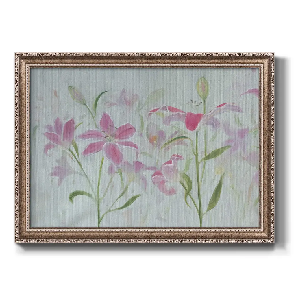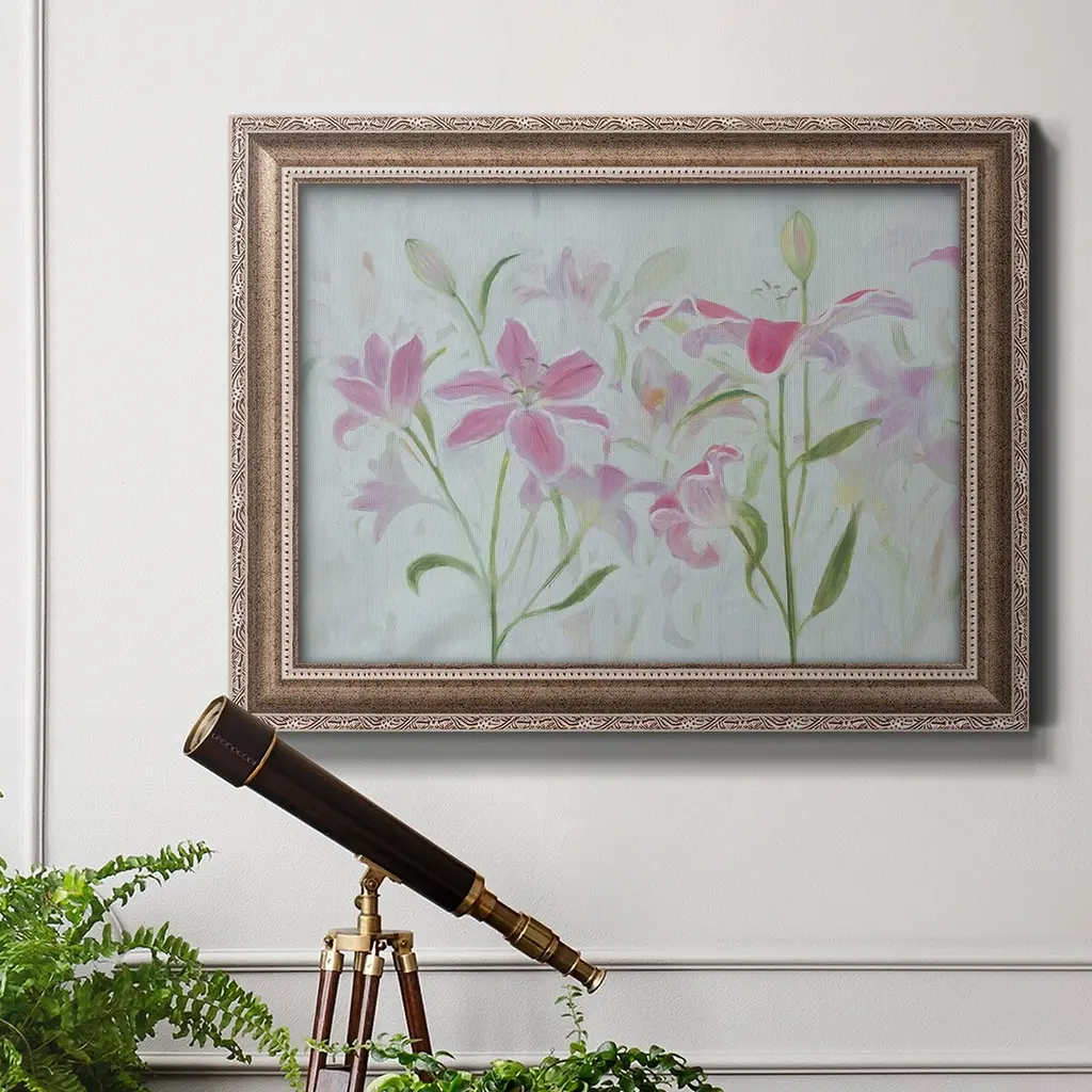 Dancing Pink Trio I Premium Framed Canvas- Ready to Hang A Premium Framed Canvas created to last. Framed in distressed wood and available in an array of sizes and colors Featuring a beveled a solid wood stretcher bar, each piece comes ready to hand 3 SIZES AVAILABLE 16''X20'' - Overall Size 18'X27'' - Overall Size 24''x36'' - Overall Size Each piece is made to order. Each piece comes with hanging hardware. Made in the USA Ready to Hang Giclee Paper Print Acrylic Glass Beveled Matt Board