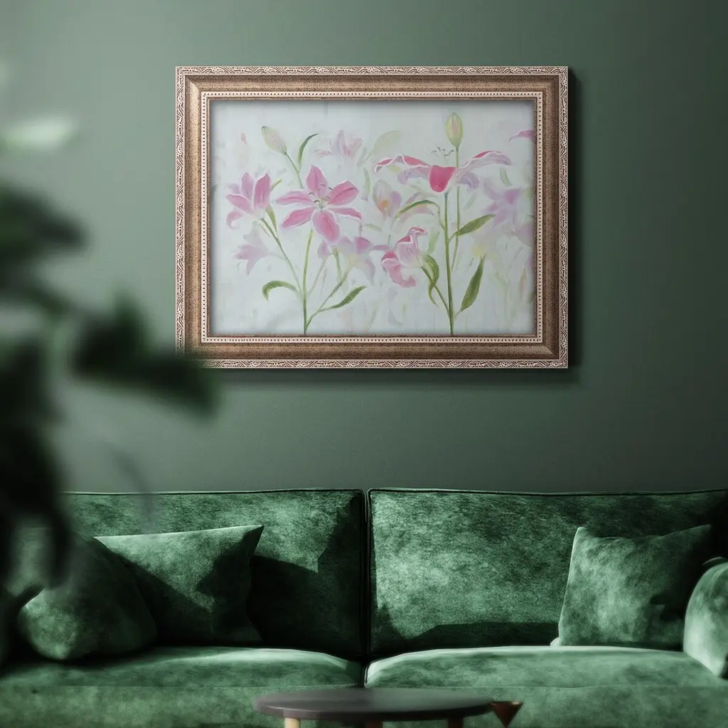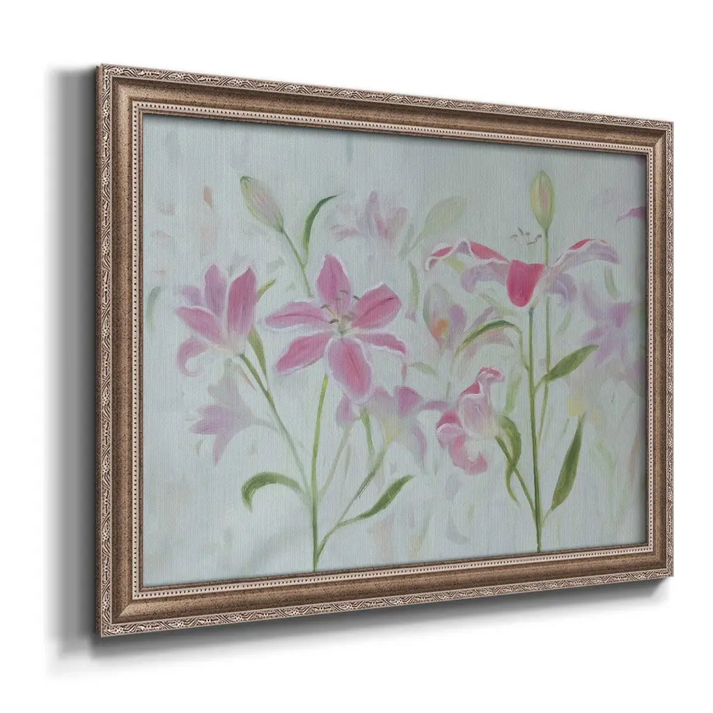 Dancing Pink Trio I Premium Framed Canvas- Ready to Hang A Premium Framed Canvas created to last. Framed in distressed wood and available in an array of sizes and colors Featuring a beveled a solid wood stretcher bar, each piece comes ready to hand 3 SIZES AVAILABLE 16''X20'' - Overall Size 18'X27'' - Overall Size 24''x36'' - Overall Size Each piece is made to order. Each piece comes with hanging hardware. Made in the USA Ready to Hang Giclee Paper Print Acrylic Glass Beveled Matt Board
