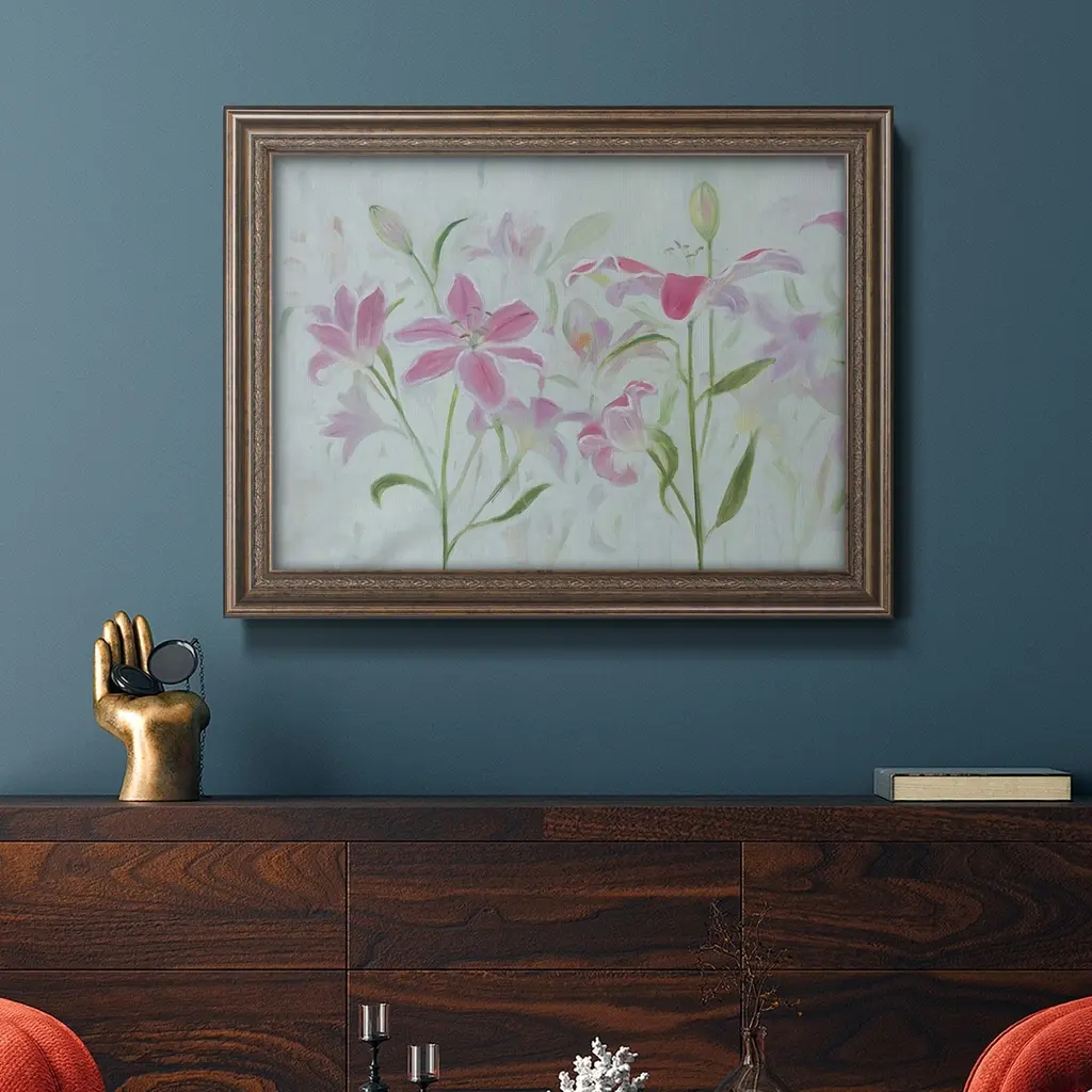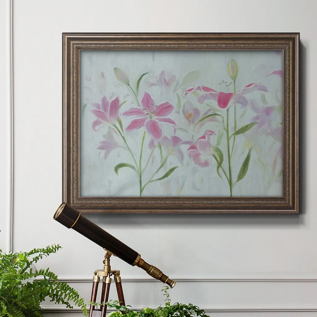 Dancing Pink Trio I Premium Framed Canvas- Ready to Hang A Premium Framed Canvas created to last. Framed in distressed wood and available in an array of sizes and colors Featuring a beveled a solid wood stretcher bar, each piece comes ready to hand 3 SIZES AVAILABLE 16''X20'' - Overall Size 18'X27'' - Overall Size 24''x36'' - Overall Size Each piece is made to order. Each piece comes with hanging hardware. Made in the USA Ready to Hang Giclee Paper Print Acrylic Glass Beveled Matt Board