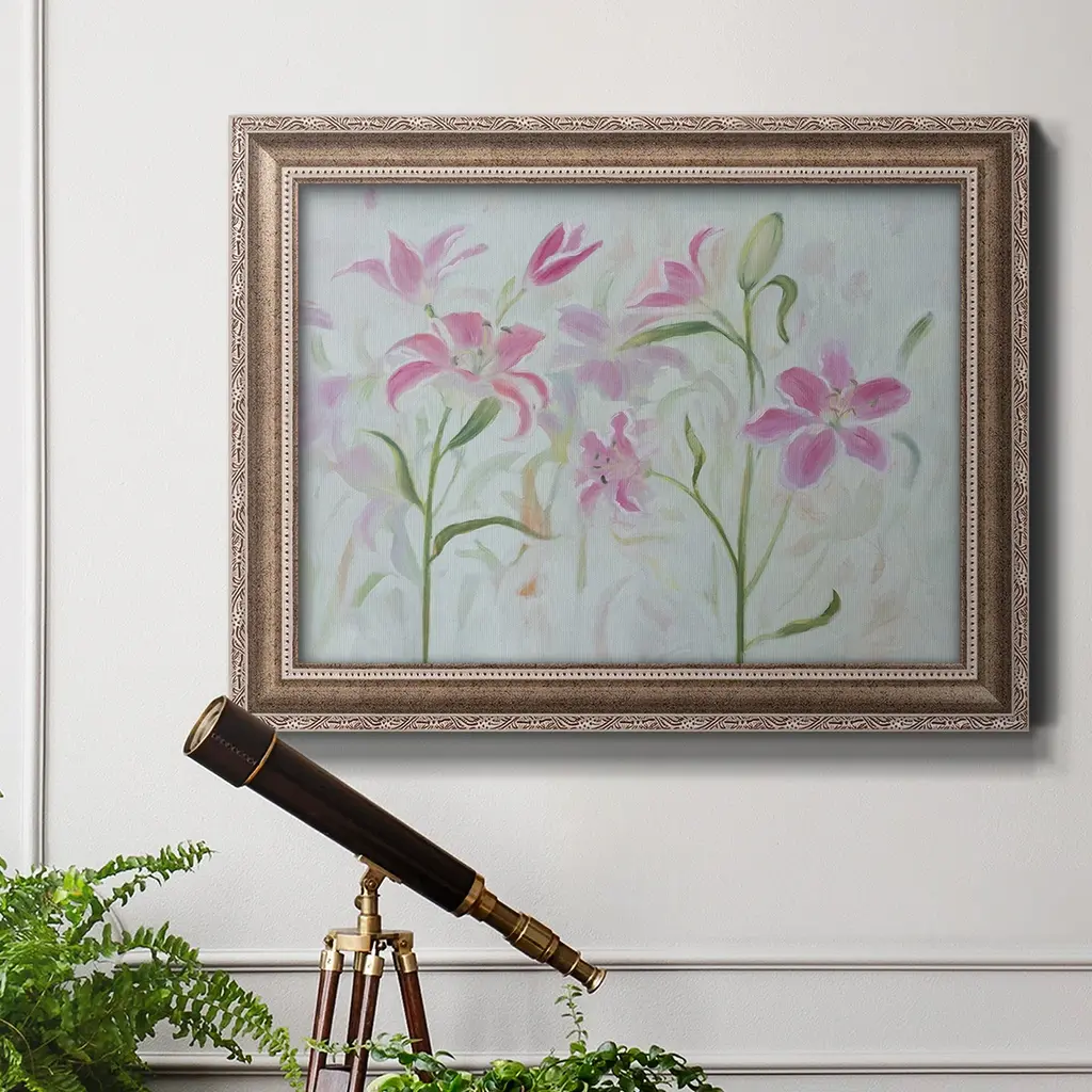 Dancing Pink Trio II Premium Framed Canvas- Ready to Hang A Premium Framed Canvas created to last. Framed in distressed wood and available in an array of sizes and colors Featuring a beveled a solid wood stretcher bar, each piece comes ready to hand 3 SIZES AVAILABLE 16''X20'' - Overall Size 18'X27'' - Overall Size 24''x36'' - Overall Size Each piece is made to order. Each piece comes with hanging hardware. Made in the USA Ready to Hang Giclee Paper Print Acrylic Glass Beveled Matt Board