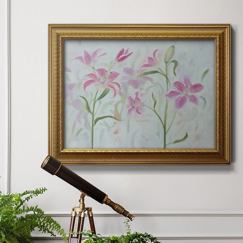 Dancing Pink Trio II Premium Framed Canvas- Ready to Hang A Premium Framed Canvas created to last. Framed in distressed wood and available in an array of sizes and colors Featuring a beveled a solid wood stretcher bar, each piece comes ready to hand 3 SIZES AVAILABLE 16''X20'' - Overall Size 18'X27'' - Overall Size 24''x36'' - Overall Size Each piece is made to order. Each piece comes with hanging hardware. Made in the USA Ready to Hang Giclee Paper Print Acrylic Glass Beveled Matt Board