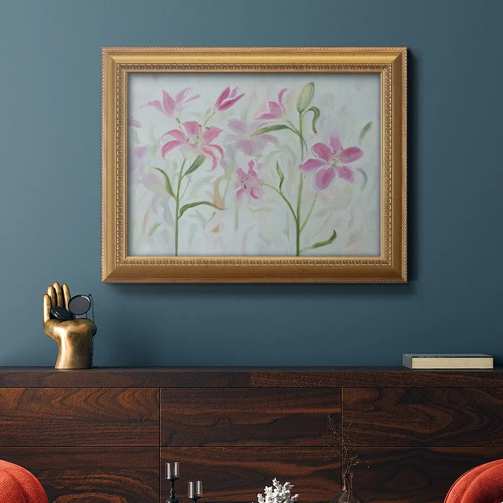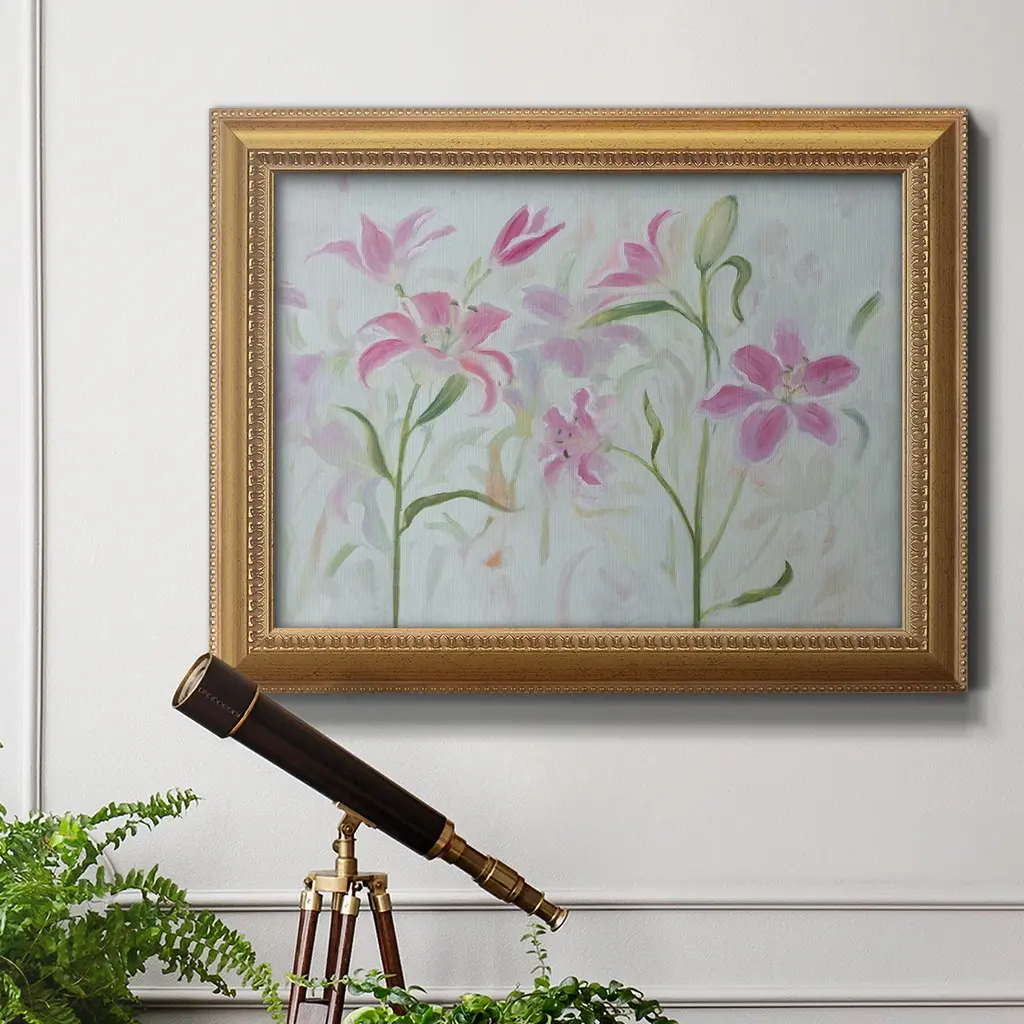 Dancing Pink Trio II Premium Framed Canvas- Ready to Hang A Premium Framed Canvas created to last. Framed in distressed wood and available in an array of sizes and colors Featuring a beveled a solid wood stretcher bar, each piece comes ready to hand 3 SIZES AVAILABLE 16''X20'' - Overall Size 18'X27'' - Overall Size 24''x36'' - Overall Size Each piece is made to order. Each piece comes with hanging hardware. Made in the USA Ready to Hang Giclee Paper Print Acrylic Glass Beveled Matt Board