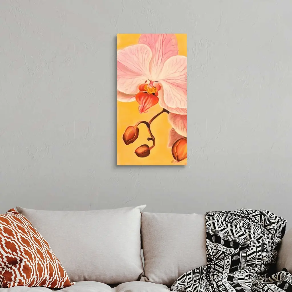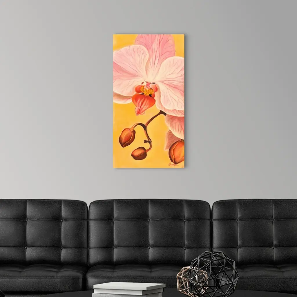 Contemporary botanical painting of a single blooming orchid on a golden background.