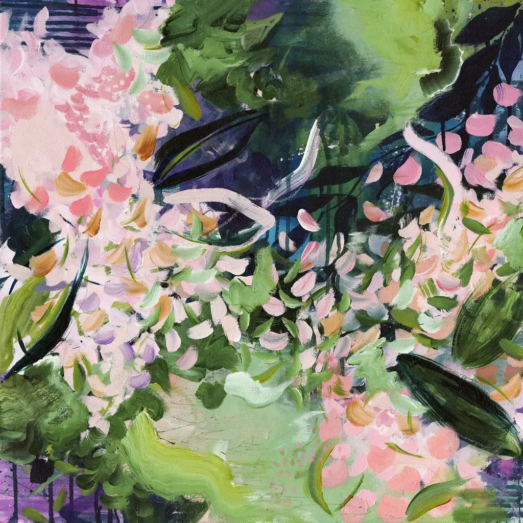 Inspired by walking in nature through a damp, autumn woodland, this piece captures the unique relationship between the pink and green hues that naturally sit alongside each other. This print acts as a window to nature when life is busy, times are hard or you simply need a moment of calm. Acting almost like a portal to a blossom garden, enchanted forest or walk in a wildflower meadow. Limited edition print of 50 and signed by the artist.Printed on heavyweight 316gsm cotton rag textured paper using archival-quality inks, this fine art giclée print will maintain its beautiful vibrancy for many years to come. The printed area is approximately 40x40cm with a small white border to ensure it perfectly fits within a 40x40cm aperture mount. Print is sold unframed.