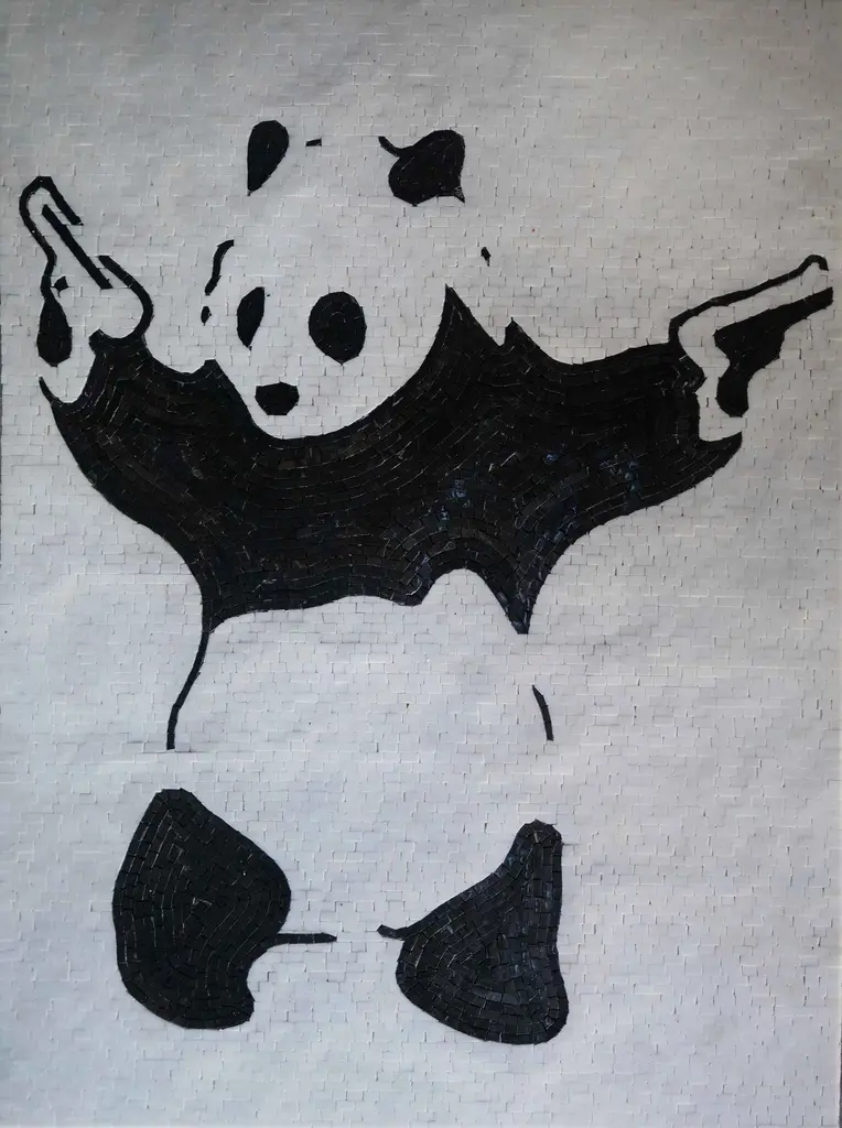 Introducing the Dangerous Panda - Mosaic Wall Art, a stunning piece that is sure to capture attention and spark conversation in any space. This vibrant mosaic artwork showcases a chubby, fierce-looking panda bearing an expression of playful defiance, expertly crafted from intricate black detailing and luxurious neutral-toned marble stones. The unique configuration of the mosaic highlights the panda's character, with arms boldly raised, each paw gripping a gun, infusing the piece with a humorous yet edgy vibe that perfectly blends charm and attitude.Ideal for both indoor and outdoor settings, this mural mosaic seamlessly complements any decor style, whether you're looking to enhance your living room, hallway, garden, or patio. The combination of the panda's whimsical expression and the high-quality materials ensures durability and longevity, making it an excellent investment for art lovers and animal enthusiasts alike. Crafted with precision and attention to detail, the Dangerous Panda serves as a striking focal point, offering a perfect conversation starter for guests and a distinctive touch to your environment. Each stone in the mosaic is meticulously placed to create depth and texture, allowing the artwork to catch the light and draw the eye from various angles. Bring a dash of mischief and personality into your space with the Dangerous Panda - Mosaic Wall Art. This piece isn't just a decoration; it’s a statement, bringing together artistry and humor in a captivating way. Whether displayed in a modern home, eclectic gallery, or an artistic office space, this mural will elevate your decor and make a bold impression. Transform your surroundings today with this enchanting and rebellious panda creation!