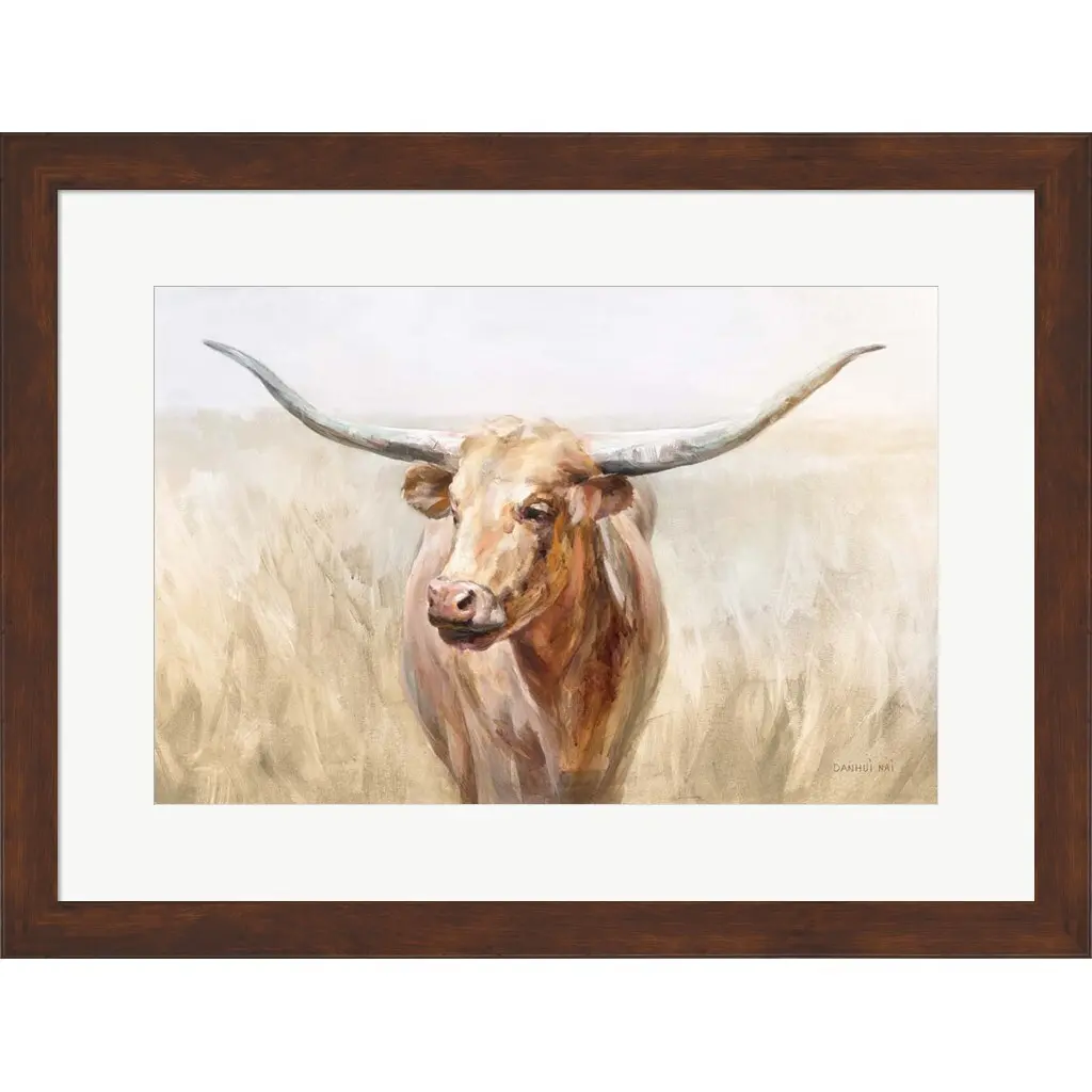 Big Sky Longhorn Neutral by Danhui Nai is a high quality piece of framed artwork. The finished size of this piece is 24.75" X 18.75". It has a Slim Solid Pecan Brown Flat with Satin Finish frame, is single matted and finished with high quality Acrylic Plexiglass. 100% Satisfaction Guaranteed.