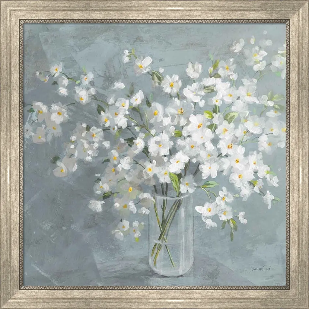 Fresh White Bouquet Gray Crop by Danhui Nai is a high quality piece of framed artwork. The finished size of this piece is 23" x 23". It has a Classic Champagne Silver with Ornate Inner Edge frame and is finished with high quality Acrylic Plexiglass. 100% Satisfaction Guaranteed.