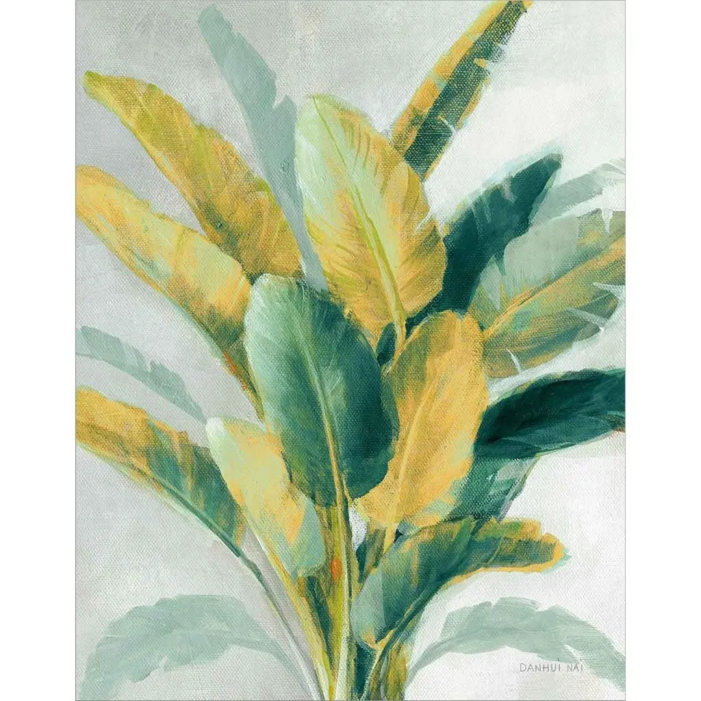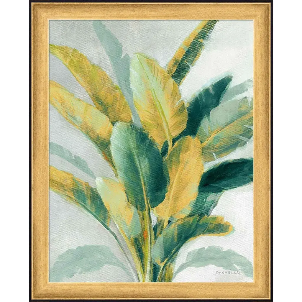 Greenhouse Palm II Teal Green and Gold Crop by Danhui Nai is a high quality piece of framed artwork. The finished size of this piece is 18.5" x 23". It has a Gold Black Accent Contemporary frame and is finished with high quality Acrylic Plexiglass. 100% Satisfaction Guaranteed.
