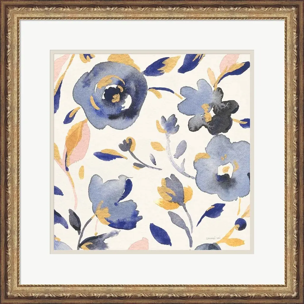 May Flowers II by Danhui Nai is a high quality piece of framed artwork. The finished size of this piece is 21.25" X 21.25". It has a Slim Champagne Silver and Gray with Ornate Floral Detail frame, is double matted and finished with high quality Acrylic Plexiglass. 100% Satisfaction Guaranteed.