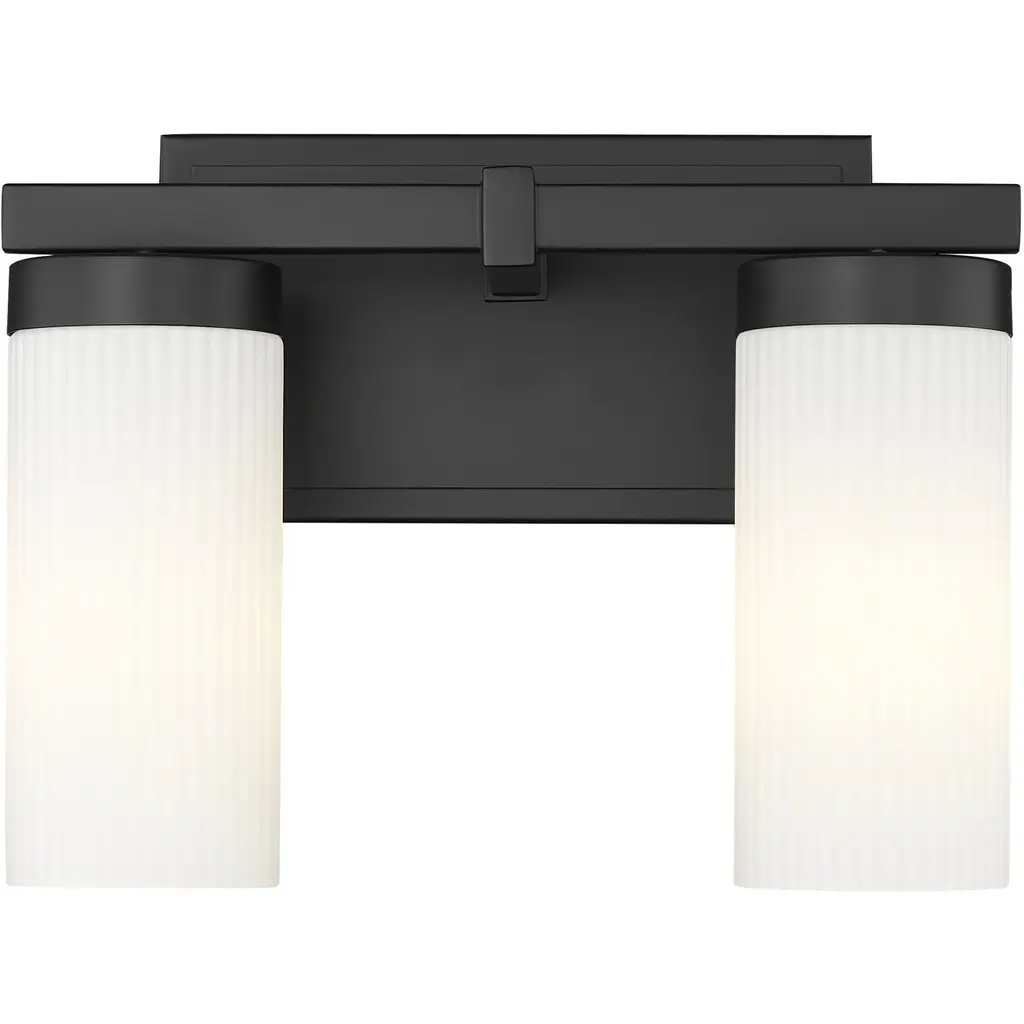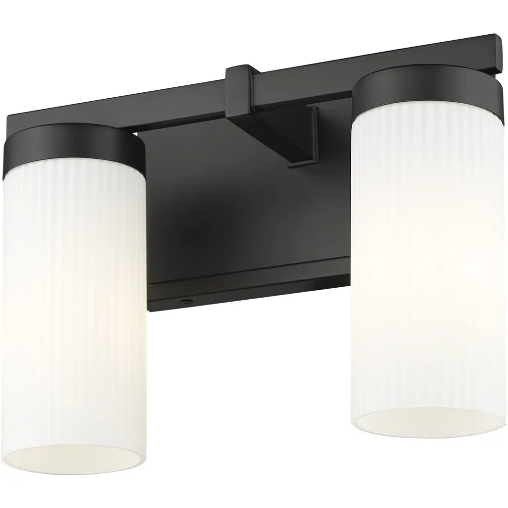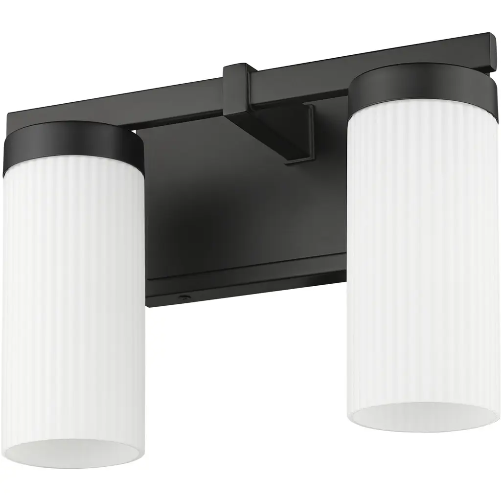 Bring a sense of streamlined elegance to your bath with a modern two-light vanity fixture. Offering beautiful, bright illumination with cylindrical white glass shades, it's anchored with a matte black finish frame with a robust design and clean straight lines for a fresh, inviting perspective.