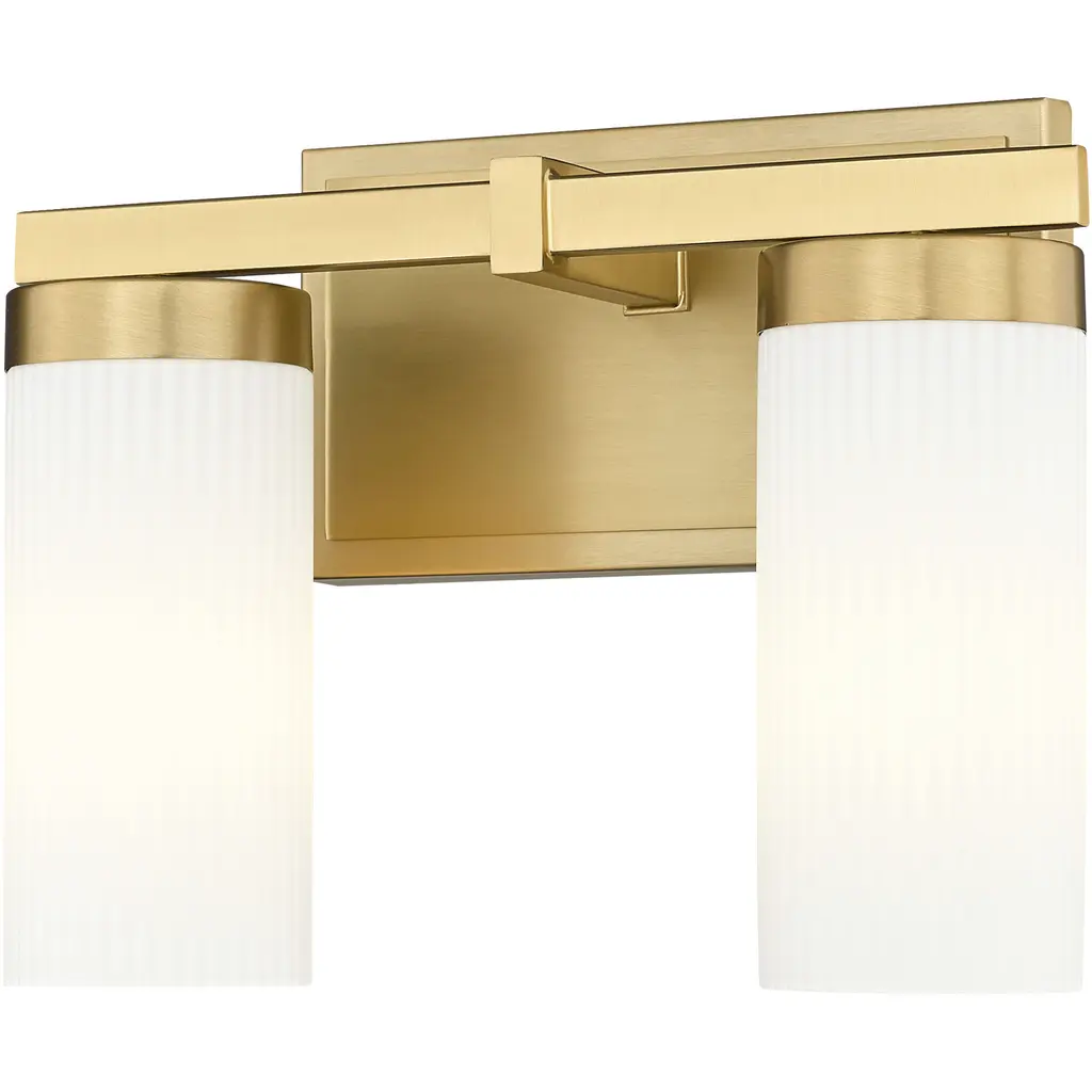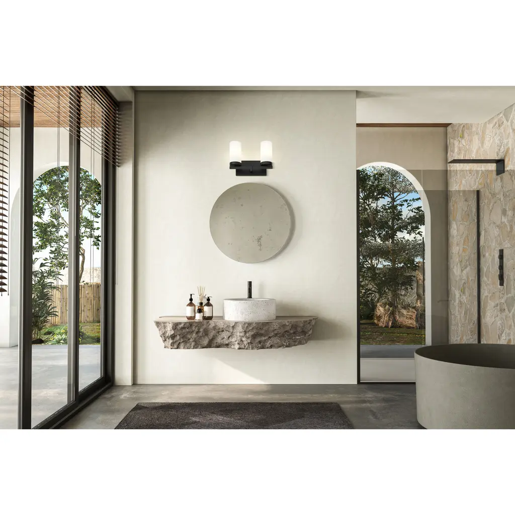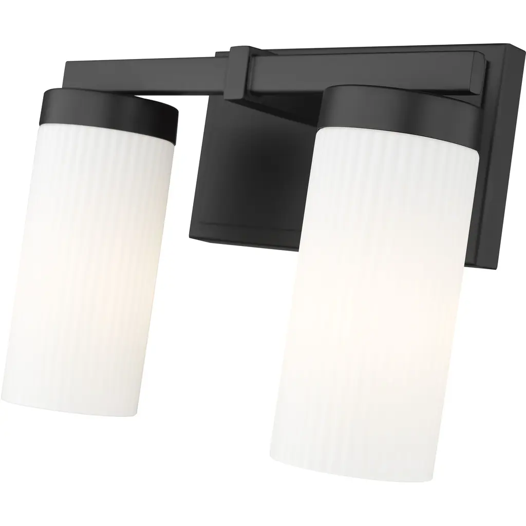 Bring a sense of streamlined elegance to your bath with a modern two-light vanity fixture. Offering beautiful, bright illumination with cylindrical white glass shades, it's anchored with a matte black finish frame with a robust design and clean straight lines for a fresh, inviting perspective.
