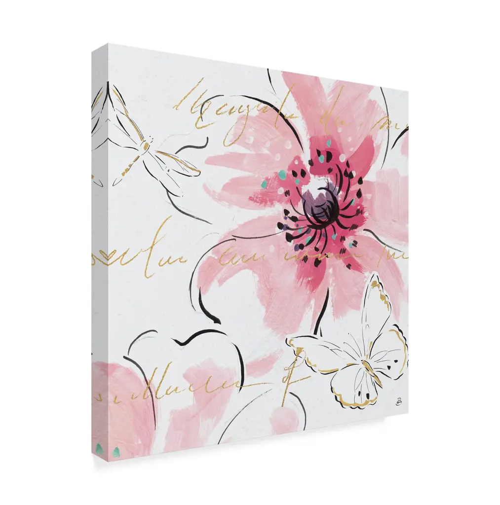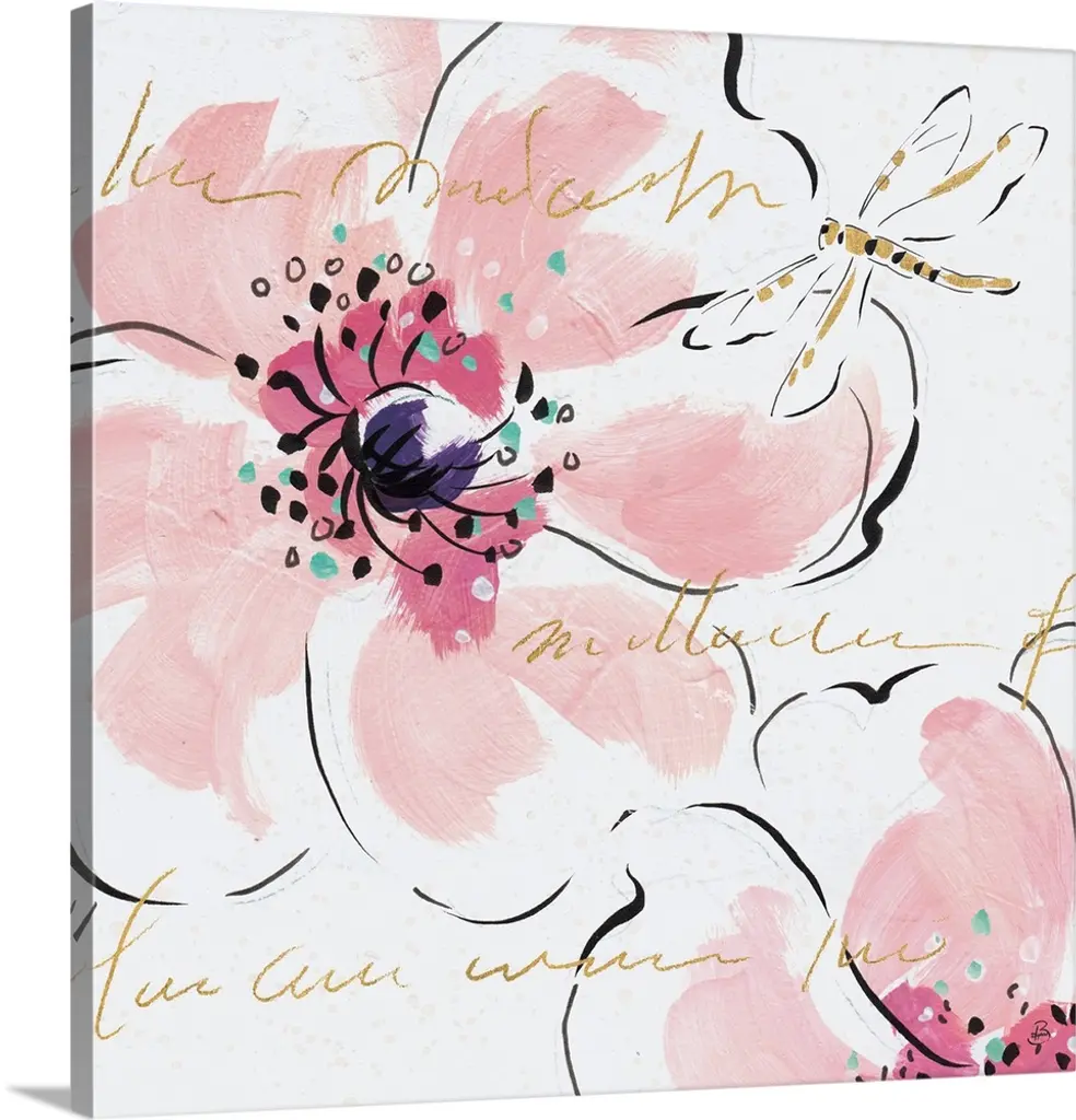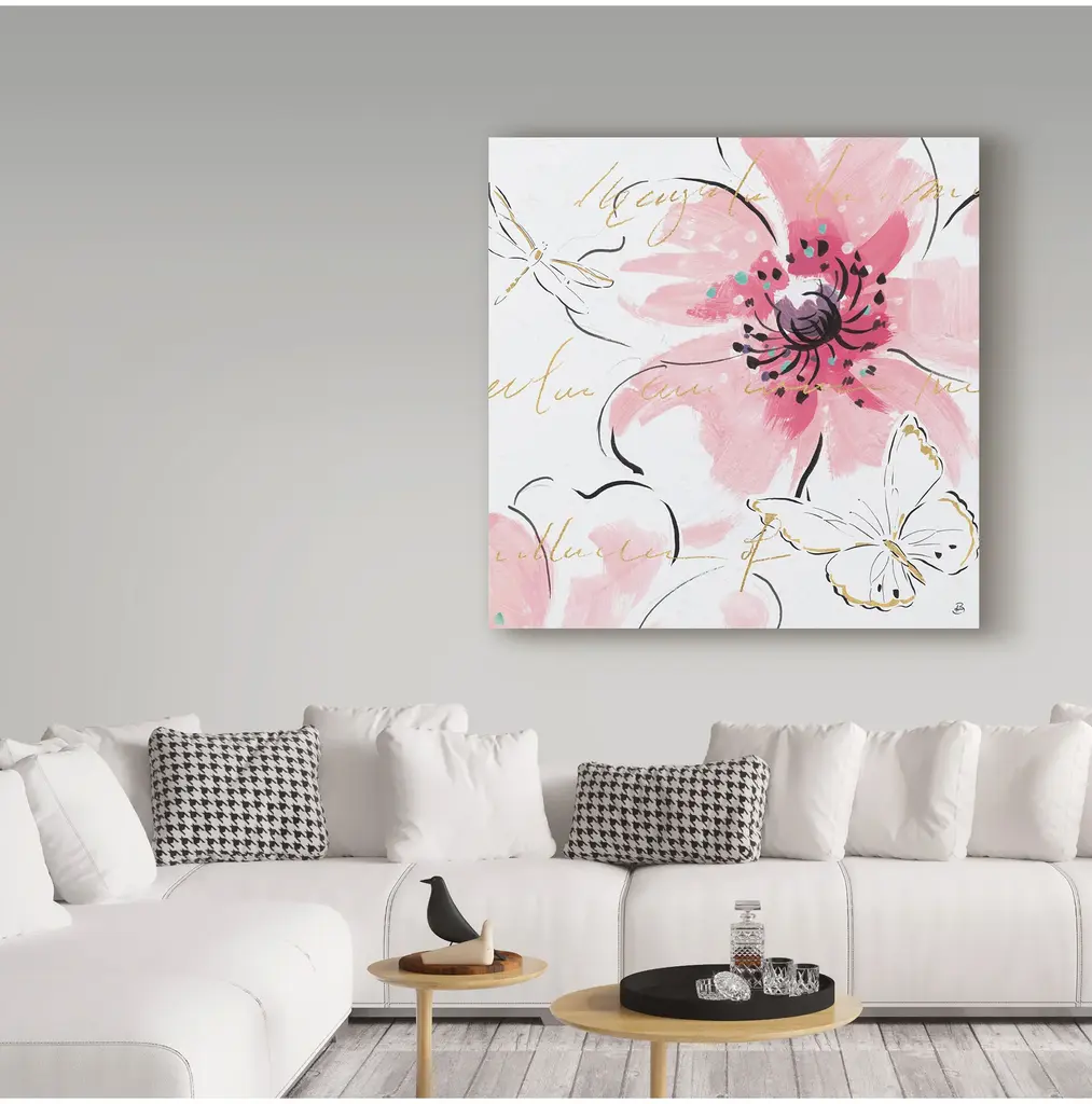 Artist: Daphne BrissonnetSubject: FloralStyle: Cottage/CountryProduct Type: Gallery-Wrapped Canvas ArtMade in USAThis ready to hang, gallery-wrapped art piece features pink flowers and a gold butterfly on a white background.Daphne Brissonnet has always been drawn to the beauty of nature. Her early studies in botany opened her eyes to the form, dimension and subtle colors of her natural subjects. As she discovered a universe of unexpected beauty in the flowers and plants she studied, painting these subjects became an important part of her life, while revealing her talents as an artist. Primarily self-taught, Daphne continues to refine her skills by attending workshops in France and the U.S. as well as closer to her home in Canada.Giclee (jee-clay) is an advanced printmaking process for creating high quality fine art reproductions. The attainable excellence that Giclee printmaking affords makes the reproduction virtually indistinguishable from the original piece. The result is wide acceptance of Giclee by galleries, museums, and private collectors. Gallery wrap is a method of stretching an artist's canvas so that the canvas wraps around the sides and is secured a hidden, wooden frame. This method of stretching and preparing a canvas allows for a frameless presentation of the finished painting.