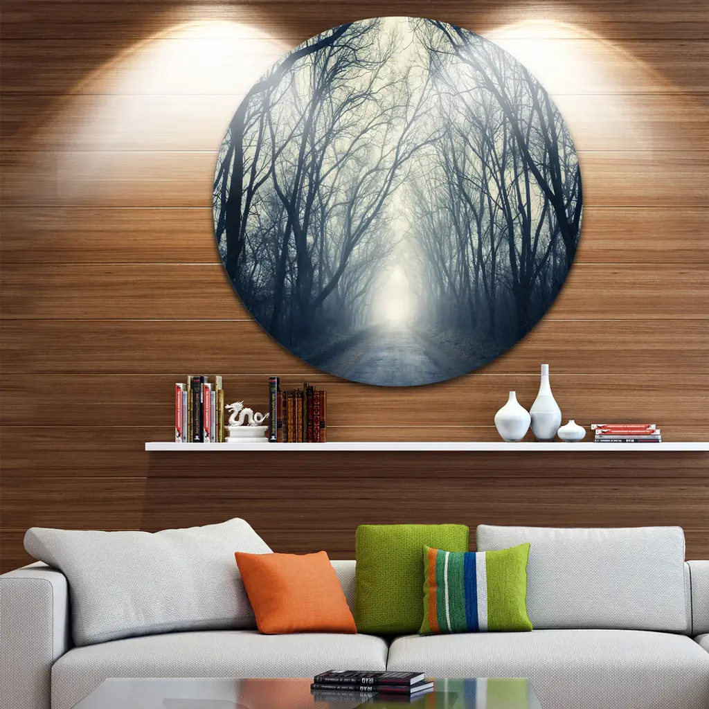 Bring Contemporary Abstraction to your home with this large Circle Metal wall art. This Dark Autumn Forest in Fog Metal Artwork makes it the focal point of any room or office. - White Gloss Coating ensures colors are extra vibrant with light reflection.- Aluminum grade Sheet Metal with 1 inch mounting frame on the back giving the illusion that the artwork is floating on the wall..- Mounting Brackets are included along with instructions.- High Quality Digital images are created directly into a glossy aluminum panel producing a stunning and captivating print into the glossy finish of the metal.- Water, Fire and Scratch resistant HD Aluminum panels.- Looks better than any photo paper and guaranteed to last at least 20 years- Easy to clean with a microfiber cloth. Colors are far superior to regular Canvas Art. - Easy to Hang