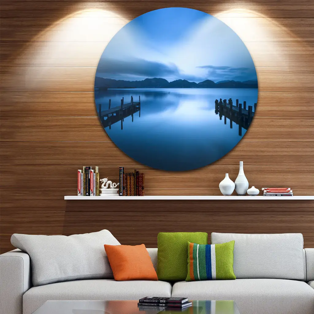 Bring Contemporary Abstraction to your home with this large Circle Metal wall art. This Dark Blue Sea and Piers Metal Artwork makes it the focal point of any room or office. - White Gloss Coating ensures colors are extra vibrant with light reflection.- Aluminum grade Sheet Metal with 1 inch mounting frame on the back giving the illusion that the artwork is floating on the wall..- Mounting Brackets are included along with instructions.- High Quality Digital images are created directly into a glossy aluminum panel producing a stunning and captivating print into the glossy finish of the metal.- Water, Fire and Scratch resistant HD Aluminum panels.- Looks better than any photo paper and guaranteed to last at least 20 years- Easy to clean with a microfiber cloth. Colors are far superior to regular Canvas Art. - Easy to Hang
