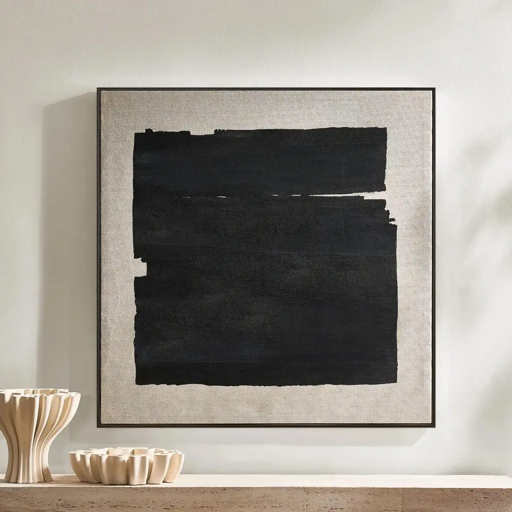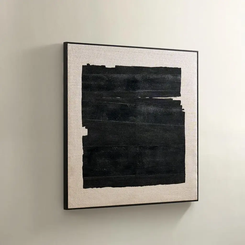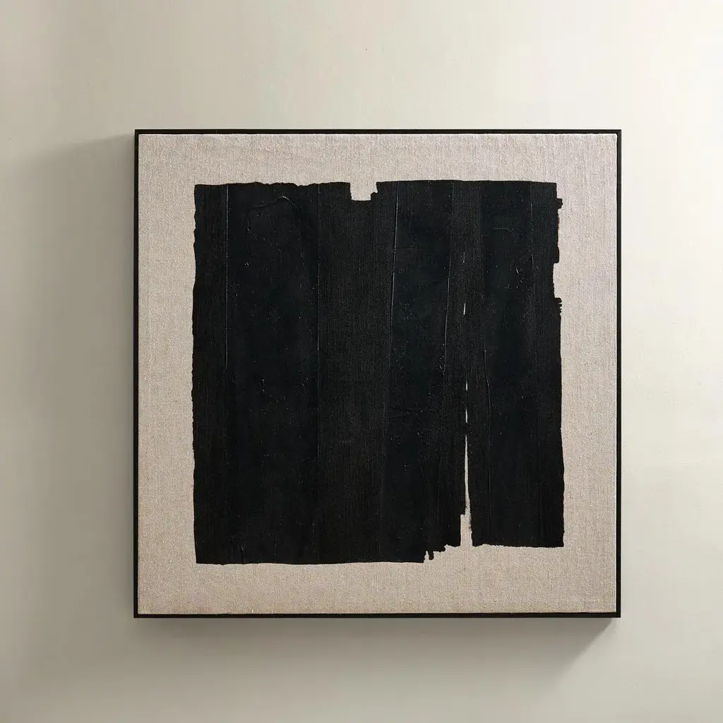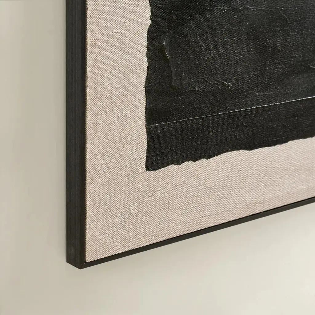 Minimalism meets texture in Dark Desert. A bold black brushstroke anchors this hand-painted artwork, set against a richly woven linen canvas. The abstract composition evokes a stark horizon or weathered terrain, offering quiet drama with graphic edge. Wrapped in a solid wood floater frame in matte black, this piece elevates both modern and organic interiors. Perfect for creating a gallery wall or a striking solo statement, Dark Desert is ideal for lovers of abstract art, neutral palettes, and natural textures.