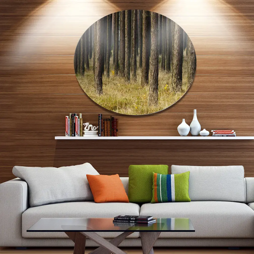 Bring Contemporary Abstraction to your home with this large Circle Metal wall art. This Dark Fall Forest with Green Grass Metal Artwork makes it the focal point of any room or office. - White Gloss Coating ensures colors are extra vibrant with light reflection.- Aluminum grade Sheet Metal with 1 inch mounting frame on the back giving the illusion that the artwork is floating on the wall..- Mounting Brackets are included along with instructions.- High Quality Digital images are created directly into a glossy aluminum panel producing a stunning and captivating print into the glossy finish of the metal.- Water, Fire and Scratch resistant HD Aluminum panels.- Looks better than any photo paper and guaranteed to last at least 20 years- Easy to clean with a microfiber cloth. Colors are far superior to regular Canvas Art. - Easy to Hang