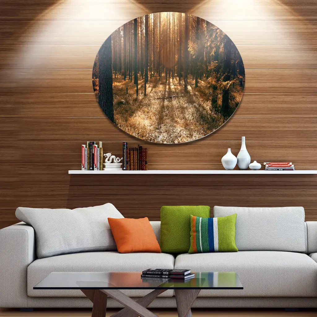 Bring Contemporary Abstraction to your home with this large Circle Metal wall art. This Dark First Snow Forest Photo Metal Artwork makes it the focal point of any room or office. - White Gloss Coating ensures colors are extra vibrant with light reflection.- Aluminum grade Sheet Metal with 1 inch mounting frame on the back giving the illusion that the artwork is floating on the wall..- Mounting Brackets are included along with instructions.- High Quality Digital images are created directly into a glossy aluminum panel producing a stunning and captivating print into the glossy finish of the metal.- Water, Fire and Scratch resistant HD Aluminum panels.- Looks better than any photo paper and guaranteed to last at least 20 years- Easy to clean with a microfiber cloth. Colors are far superior to regular Canvas Art. - Easy to Hang