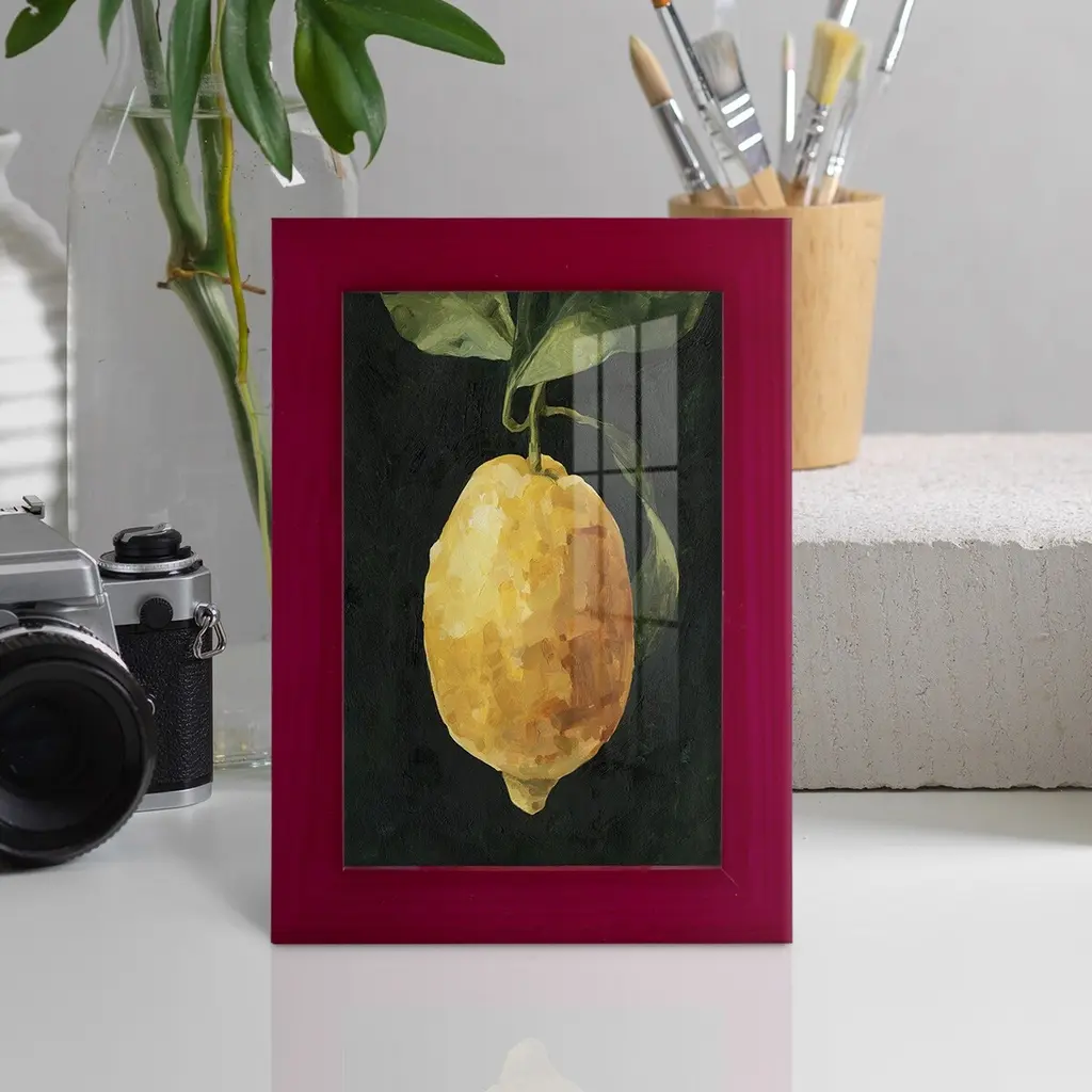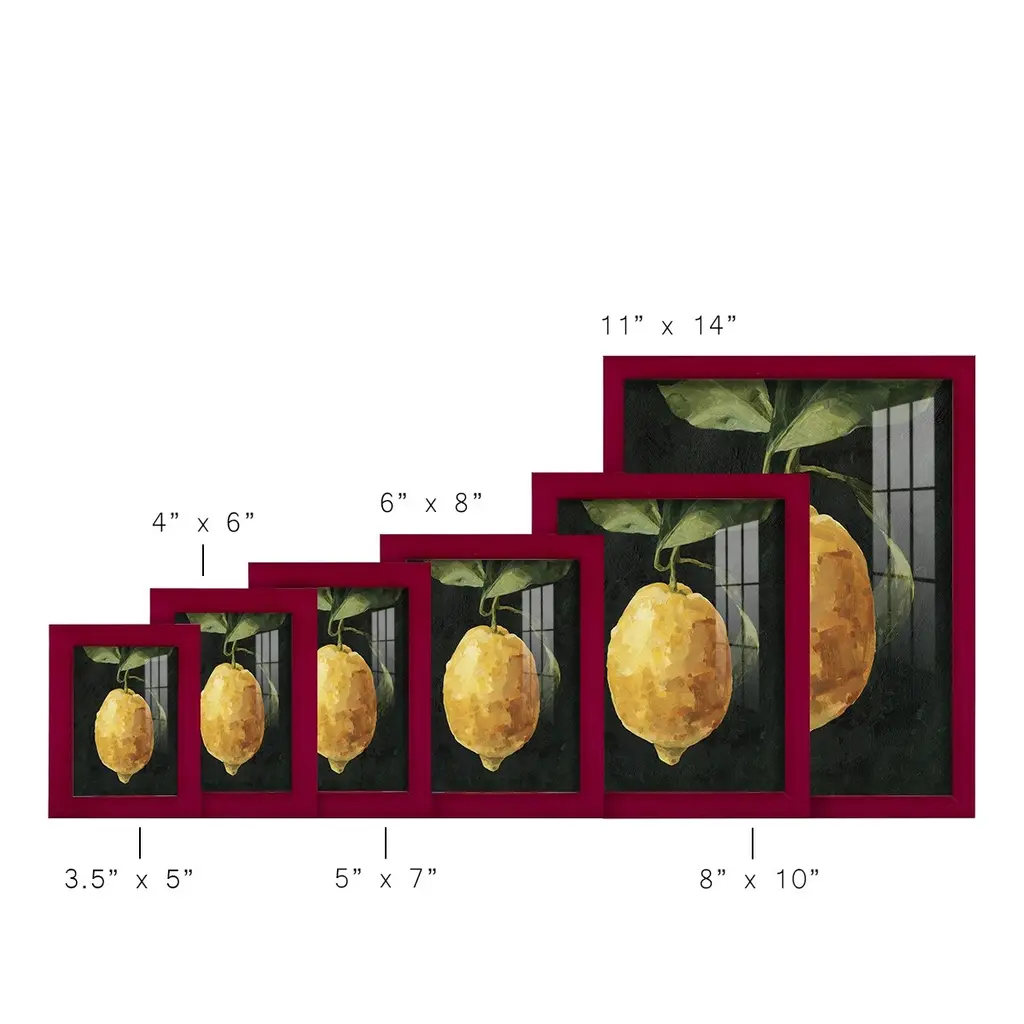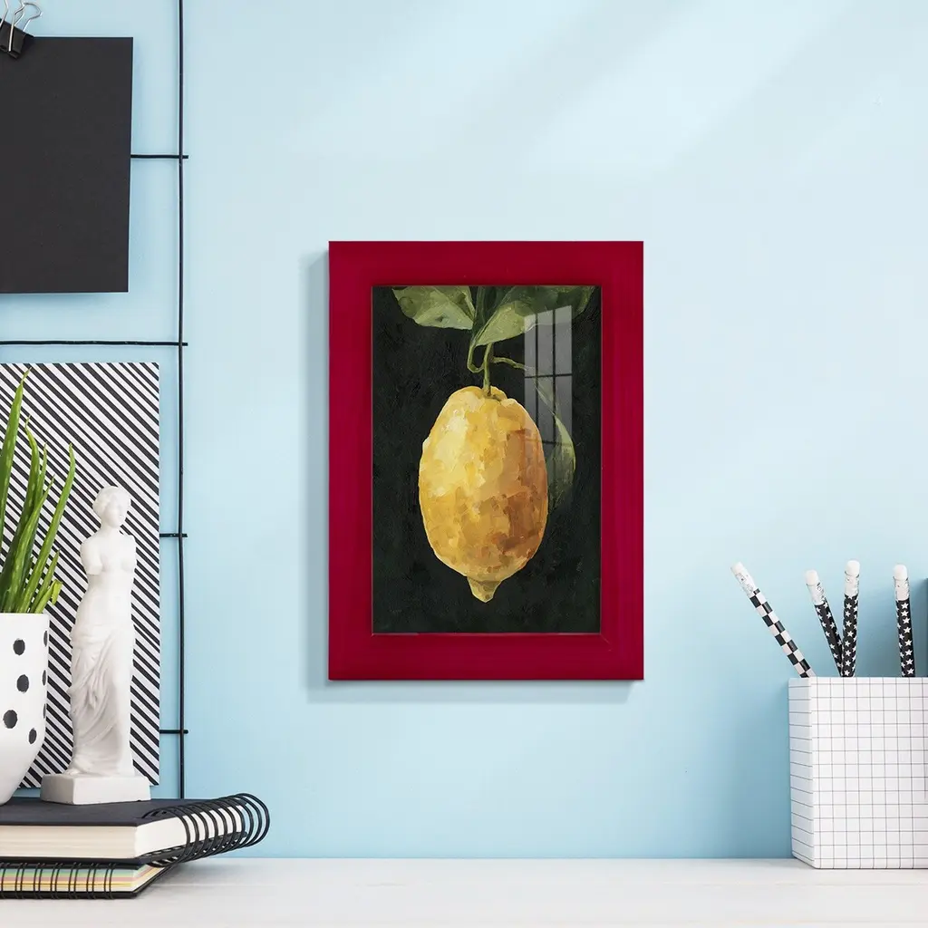 Dark Lemon I -EZ SWITCH Framed Print w/glass-Cherry Red A delightful, framed print. Featuring a solid wood frame with real wood glass. This premium print is giclee quality. In addition, every frame features a removable back and table top stand. This allows you to change your art in the future or to just stand the art on a table for a new look. We are sure you'll enjoy our new series of EZ SWITCH Framed Art. Solid Wood Frame Real Glass Removable / Replaceable Art Built in Tabletop Stand Sizes range from 4x6 up to 12x15 - buy just one or pair them up as sets as you see fit.