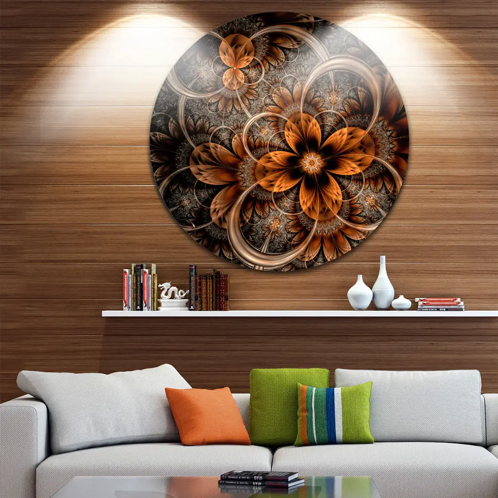 Bring Contemporary Abstraction to your home with this large Circle Metal wall art. This Dark Orange Digital Art Fractal Flower Metal Artwork makes it the focal point of any room or office. - White Gloss Coating ensures colors are extra vibrant with light reflection.- Aluminum grade Sheet Metal with 1 inch mounting frame on the back giving the illusion that the artwork is floating on the wall..- Mounting Brackets are included along with instructions.- High Quality Digital images are created directly into a glossy aluminum panel producing a stunning and captivating print into the glossy finish of the metal.- Water, Fire and Scratch resistant HD Aluminum panels.- Looks better than any photo paper and guaranteed to last at least 20 years- Easy to clean with a microfiber cloth. Colors are far superior to regular Canvas Art. - Easy to Hang