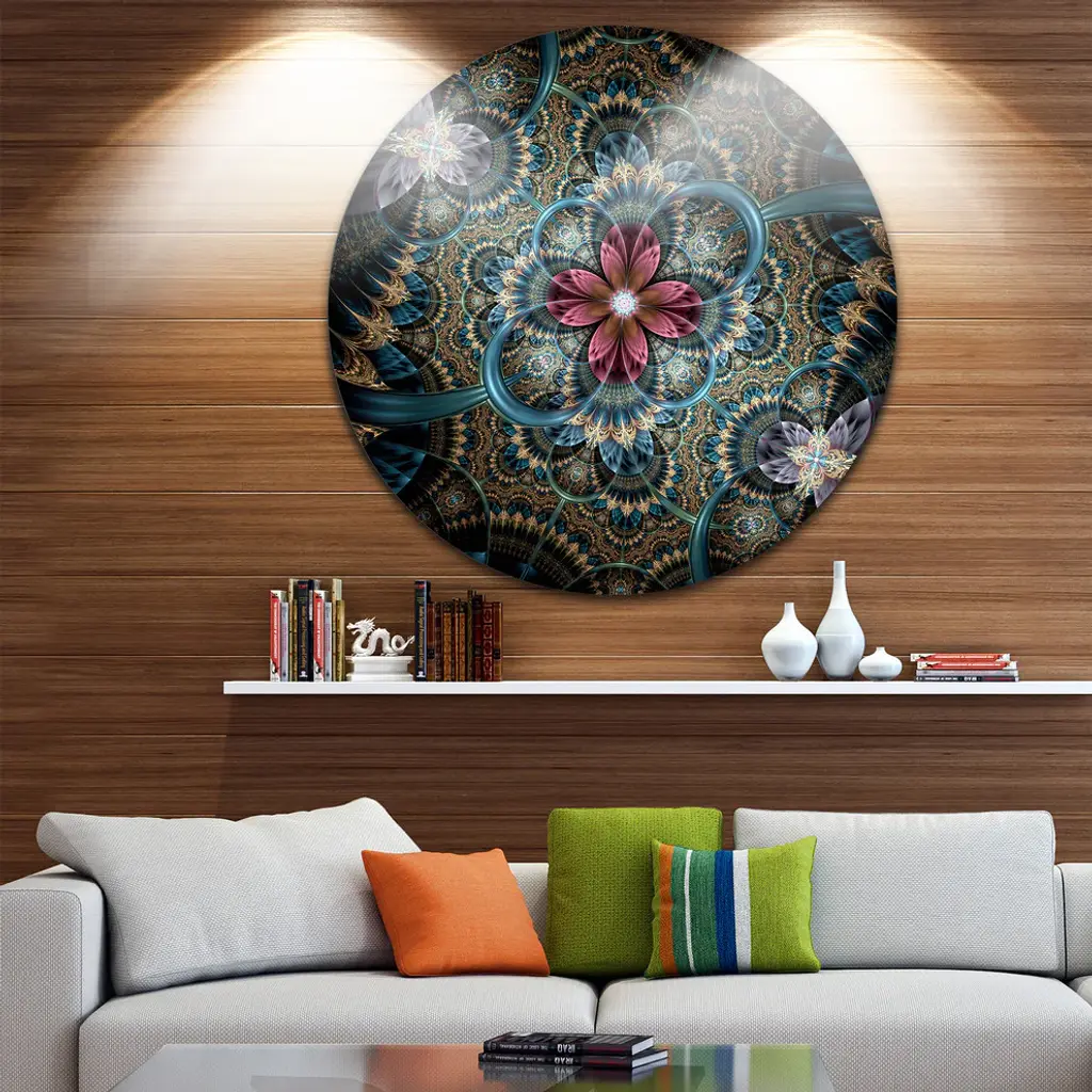 Bring Contemporary Abstraction to your home with this large Circle Metal wall art. This Dark Purple Fractal Flower Metal Artwork makes it the focal point of any room or office. - White Gloss Coating ensures colors are extra vibrant with light reflection.- Aluminum grade Sheet Metal with 1 inch mounting frame on the back giving the illusion that the artwork is floating on the wall..- Mounting Brackets are included along with instructions.- High Quality Digital images are created directly into a glossy aluminum panel producing a stunning and captivating print into the glossy finish of the metal.- Water, Fire and Scratch resistant HD Aluminum panels.- Looks better than any photo paper and guaranteed to last at least 20 years- Easy to clean with a microfiber cloth. Colors are far superior to regular Canvas Art. - Easy to Hang