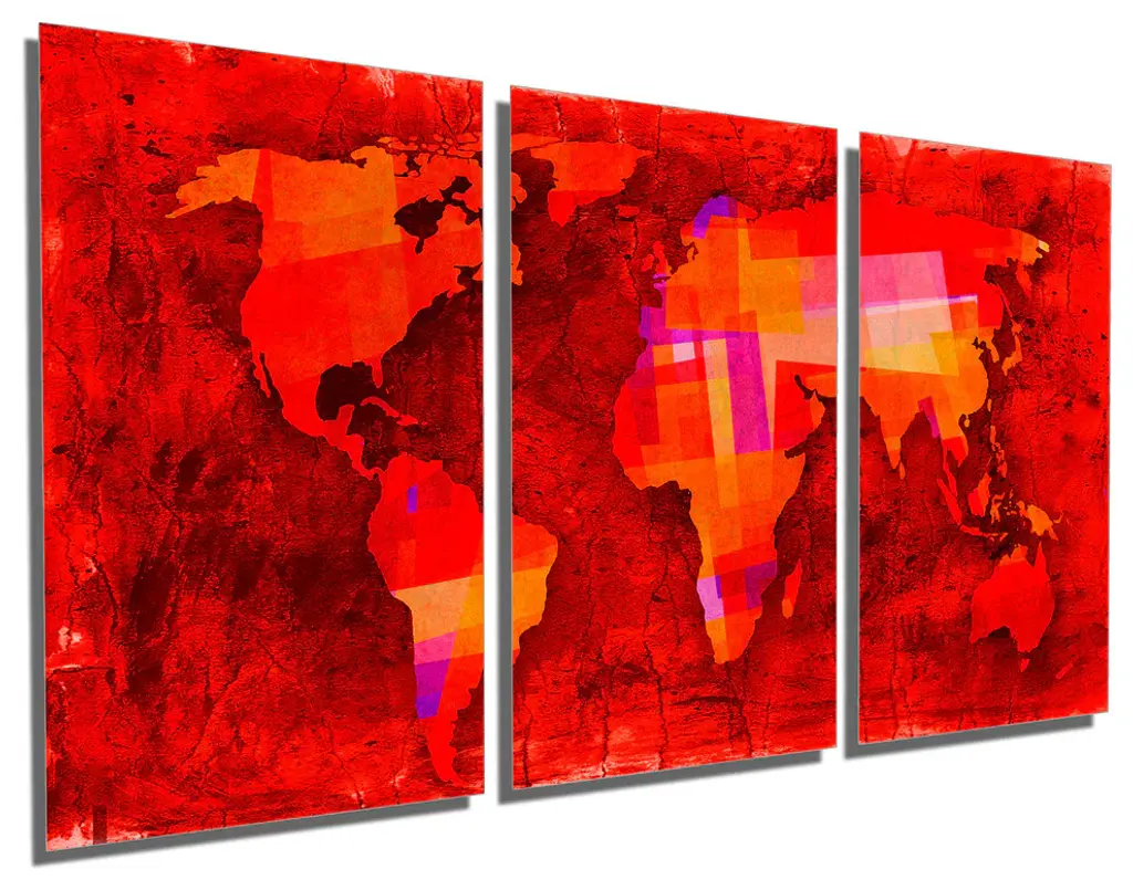48"œ x 24"œ total size. Ready To Hang! (3 pieces - 16"œ x 24"œ each). 3 Panel Split (Triptych) Blood Red abstract World Map Metal Print. Features abstract digital effect. Modern metal wall art for home or office wall decor & interior design. Printed on Luxurious, HD aluminum glossy metal panels. Multi panel art.. HD aluminum panels. Metal print wall art. Includes Shadow Wall Mount on the back.• Aluminum Metal Wall Art• Made in USA• Ready to hang - No assembly required• Shadow mount hardware on the back• 0.045"œ thick HD Aluminum Panels• Scratch resistant, glossy finish• Superb color clarity, luxurious prints• Epson printing process• For indoor or moisture rich environment use• Easy to clean. Gently wipe with microfiber cloth.