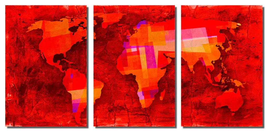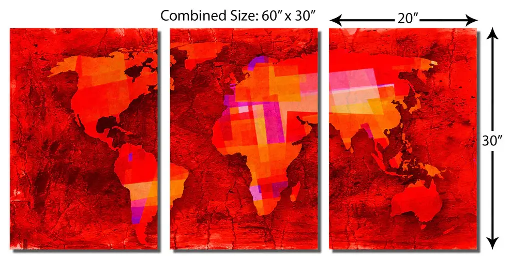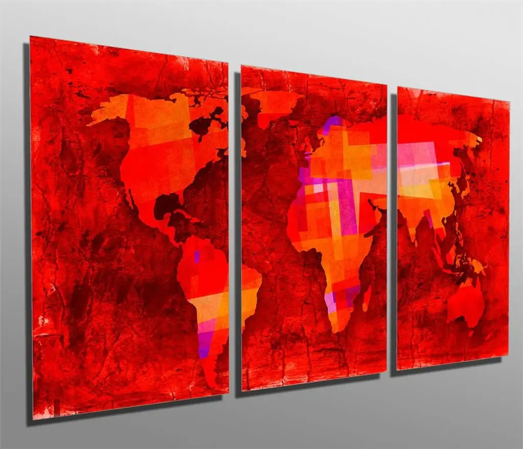 60"œ x 30"œ total size. Ready To Hang! (3 pieces - 20"œ x 30"œ each). 3 Panel Split (Triptych) Blood Red abstract World Map Metal Print. Features abstract digital effect. Modern metal wall art for home or office wall decor & interior design. Printed on Luxurious, HD aluminum glossy metal panels. Multi panel art.. HD aluminum panels. Metal print wall art. Includes Shadow Wall Mount on the back.• Aluminum Metal Wall Art• Made in USA• Ready to hang - No assembly required• Shadow mount hardware on the back• 0.045"œ thick HD Aluminum Panels• Scratch resistant, glossy finish• Superb color clarity, luxurious prints• Epson printing process• For indoor or moisture rich environment use• Easy to clean. Gently wipe with microfiber cloth.