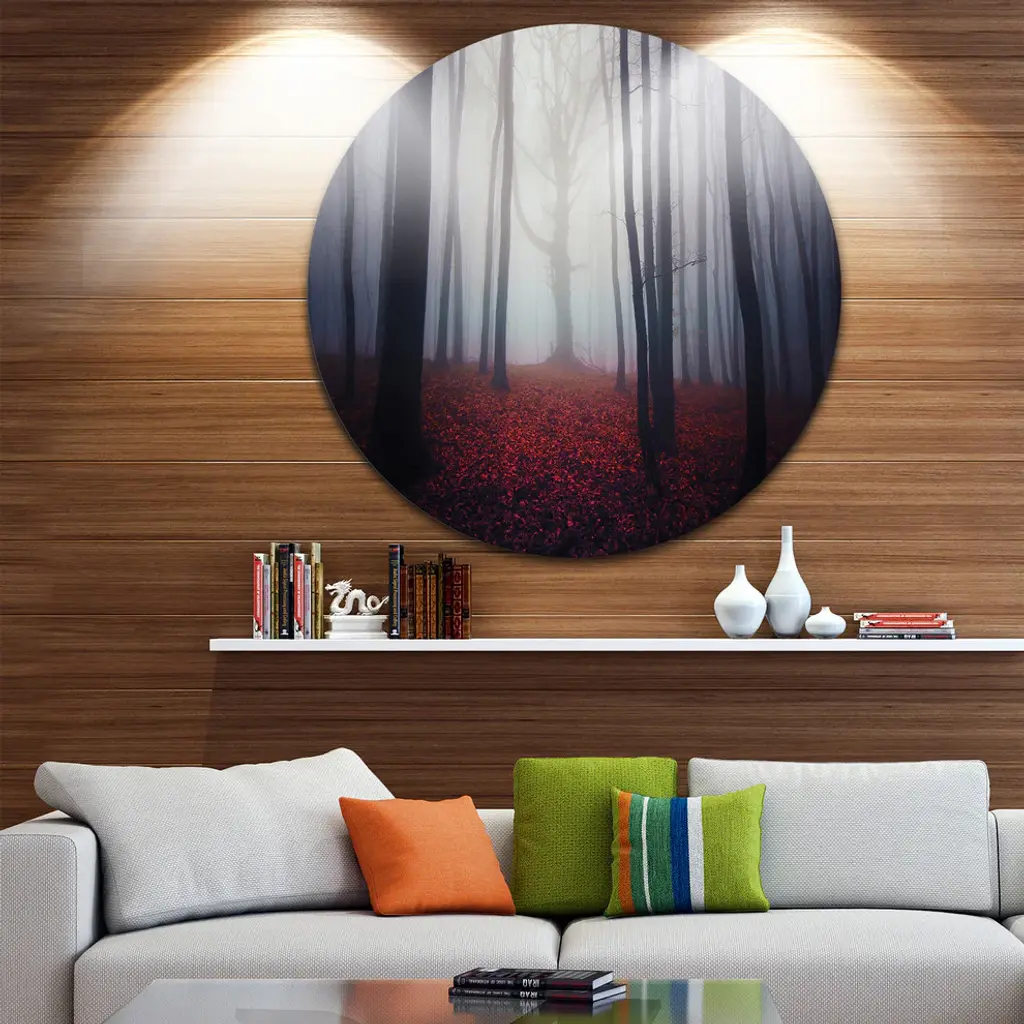 Bring Contemporary Abstraction to your home with this large Circle Metal wall art. This Dark Spooky Misty Forest Metal Artwork makes it the focal point of any room or office. - White Gloss Coating ensures colors are extra vibrant with light reflection.- Aluminum grade Sheet Metal with 1 inch mounting frame on the back giving the illusion that the artwork is floating on the wall..- Mounting Brackets are included along with instructions.- High Quality Digital images are created directly into a glossy aluminum panel producing a stunning and captivating print into the glossy finish of the metal.- Water, Fire and Scratch resistant HD Aluminum panels.- Looks better than any photo paper and guaranteed to last at least 20 years- Easy to clean with a microfiber cloth. Colors are far superior to regular Canvas Art. - Easy to Hang