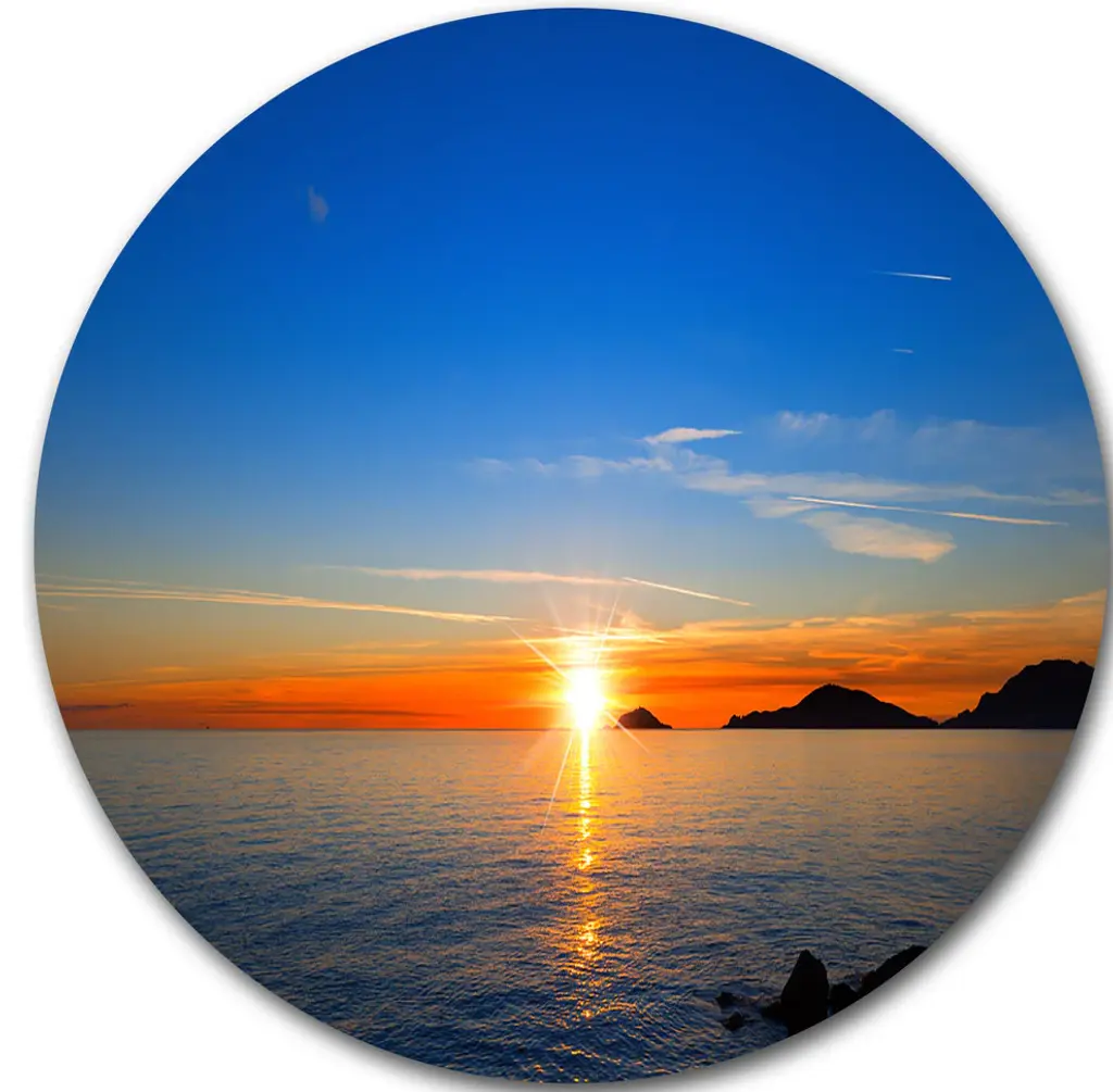 Bring Contemporary Abstraction to your home with this large Circle Metal wall art. This Dark Sunset in Gulf of La Spezia Metal Artwork makes it the focal point of any room or office. - White Gloss Coating ensures colors are extra vibrant with light reflection.- Aluminum grade Sheet Metal with 1 inch mounting frame on the back giving the illusion that the artwork is floating on the wall..- Mounting Brackets are included along with instructions.- High Quality Digital images are created directly into a glossy aluminum panel producing a stunning and captivating print into the glossy finish of the metal.- Water, Fire and Scratch resistant HD Aluminum panels.- Looks better than any photo paper and guaranteed to last at least 20 years- Easy to clean with a microfiber cloth. Colors are far superior to regular Canvas Art. - Easy to Hang