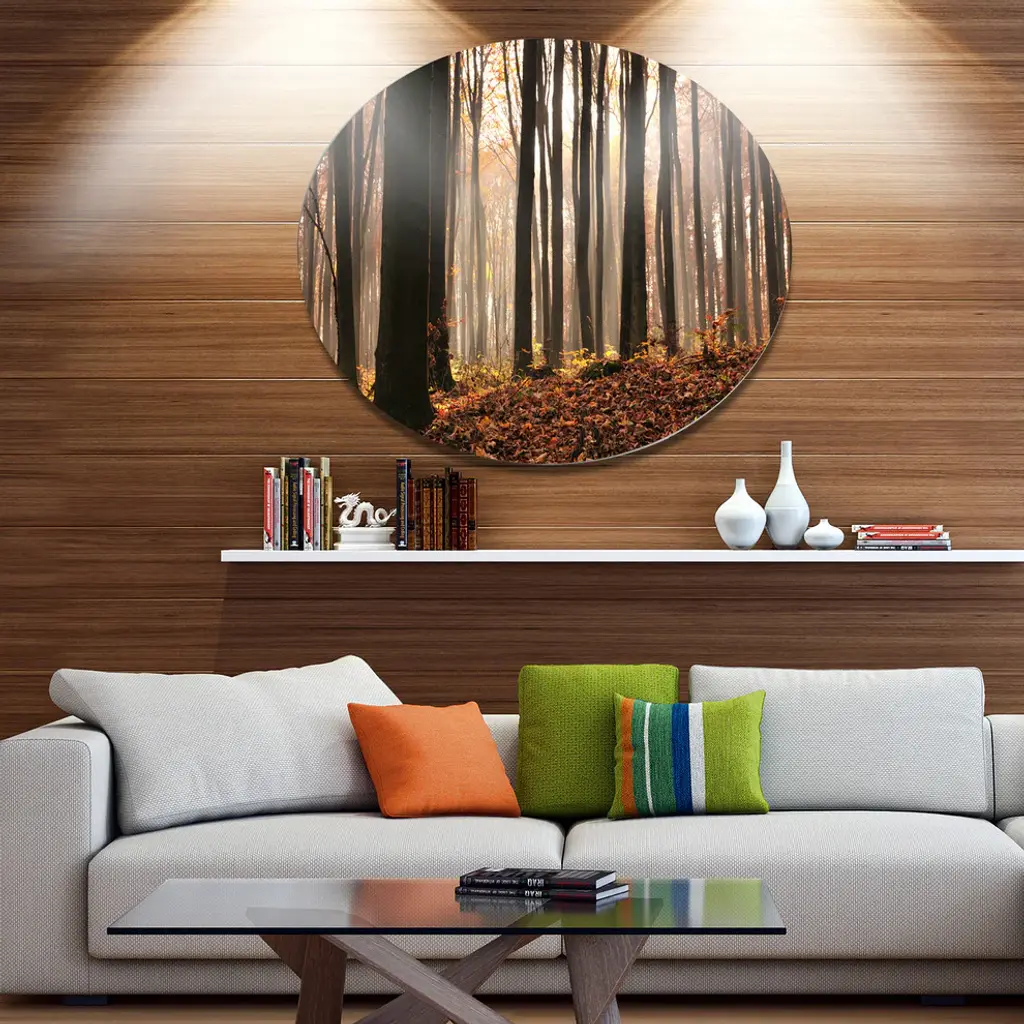 Bring Contemporary Abstraction to your home with this large Circle Metal wall art. This Dark Thick Woods in Fall Forest Metal Artwork makes it the focal point of any room or office. - White Gloss Coating ensures colors are extra vibrant with light reflection.- Aluminum grade Sheet Metal with 1 inch mounting frame on the back giving the illusion that the artwork is floating on the wall..- Mounting Brackets are included along with instructions.- High Quality Digital images are created directly into a glossy aluminum panel producing a stunning and captivating print into the glossy finish of the metal.- Water, Fire and Scratch resistant HD Aluminum panels.- Looks better than any photo paper and guaranteed to last at least 20 years- Easy to clean with a microfiber cloth. Colors are far superior to regular Canvas Art. - Easy to Hang